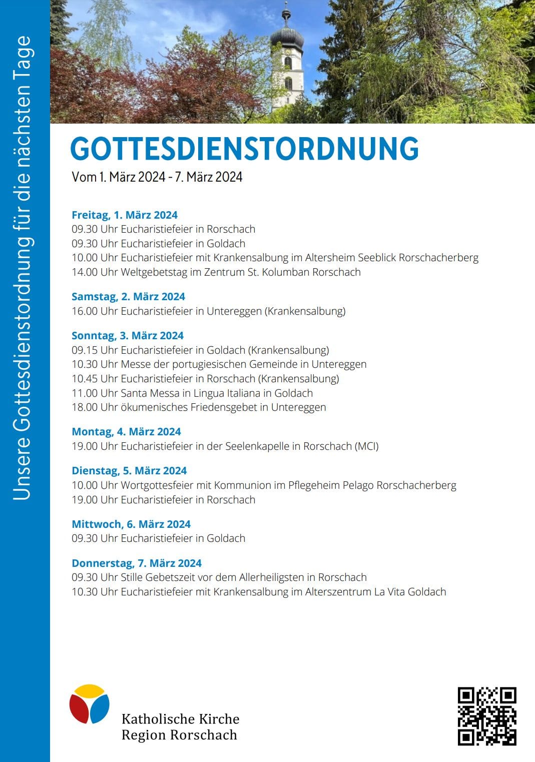 Gottesdienstordnung der KKRR für die nächsten TageThemen:Kath. RorschachKultur PartnerRegionRorschach 1. März 2024 - 05:05Gilt ab heute Freitag bis kommenden Donnerstag, 7. März 2024. Mehr Informationen finden Interessierte immer auch hier und hier.Teilen mit: Einen Link per E-Mail an einen Freund senden (Wird in neuem Fenster geöffnet) E-Mail Drucken (Wird in neuem Fenster geöffnet) Drucken Auf Facebook teilen (Wird in neuem Fenster geöffnet) Facebook Auf X teilen (Wird in neuem Fenster geöffnet) X Auf WhatsApp teilen (Wird in neuem Fenster geöffnet) WhatsApp Gefällt mir:Gefällt mir Wird geladen …Newsletter abonnieren Bitte dieses Feld leer lassenBitte wähle, ob Du über jeden neuen Beitrag sofort oder lieber jeden Morgen gegen 9 Uhr eine Zusammenfassung der neusten Beiträge erhalten möchtest.Liste(n) auswählen: Neues vom Echo (Zusammenfassung) Neues vom Echo (Sofortbenachrichtigung) Dieses Feld wird benötigt.Prüfen Sie Ihren Posteingang und den Spamordner, um Ihr Abonnement zu bestätigen.