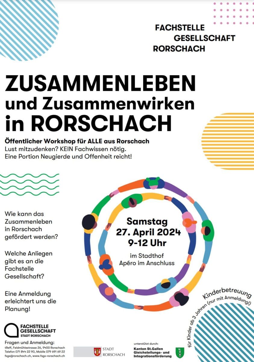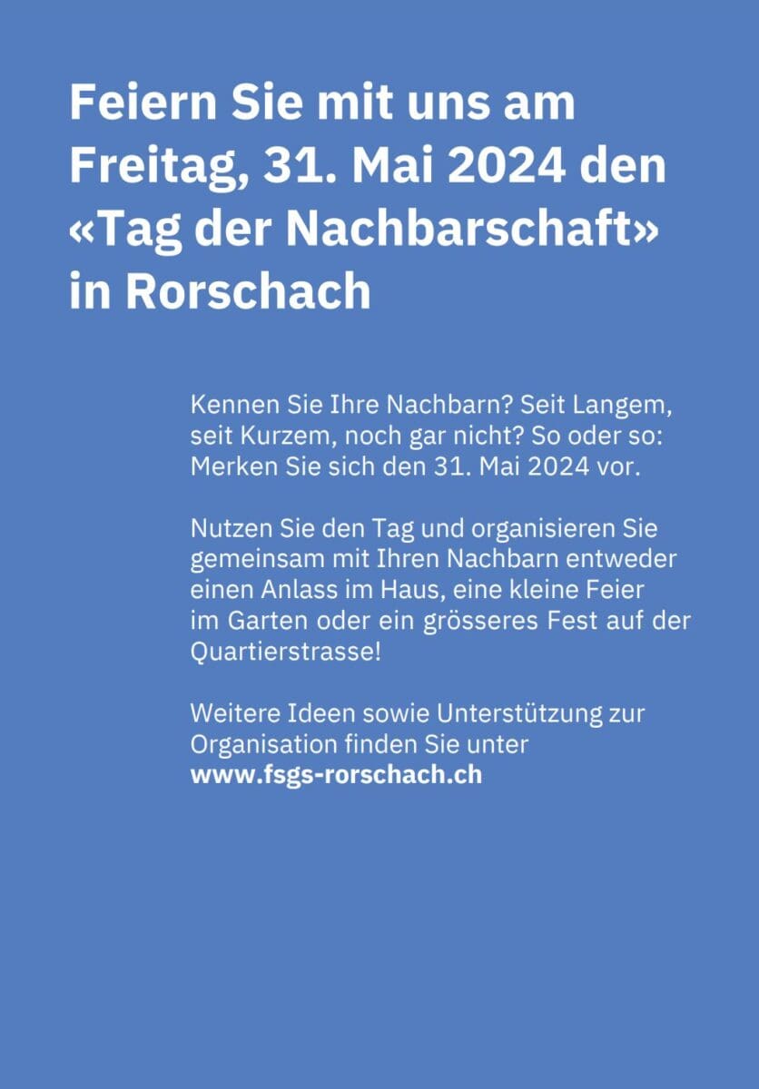 Die Fachstelle Gesellschaft nimmt sich im 2024 dem Thema „Zusammenleben in Rorschach“ an. Sie führt dazu am 27. April 2024 einen öffentlichen Workshop durch. Alle Interessierten sind eingeladen, gemeinsam Projekte zu planen. Eine weitere Möglichkeit, das Zusammenleben zu fördern, bietet sich am Tag der Nachbarschaft, der in Rorschach am 31. Mai 2024 zum zweiten Mal stattfindet. Die Fachstelle unterstützt alle, die sich an diesem Tag in ihrem Quartier engagieren möchten. Zusätzliche Informationen finden Interessierte hier.