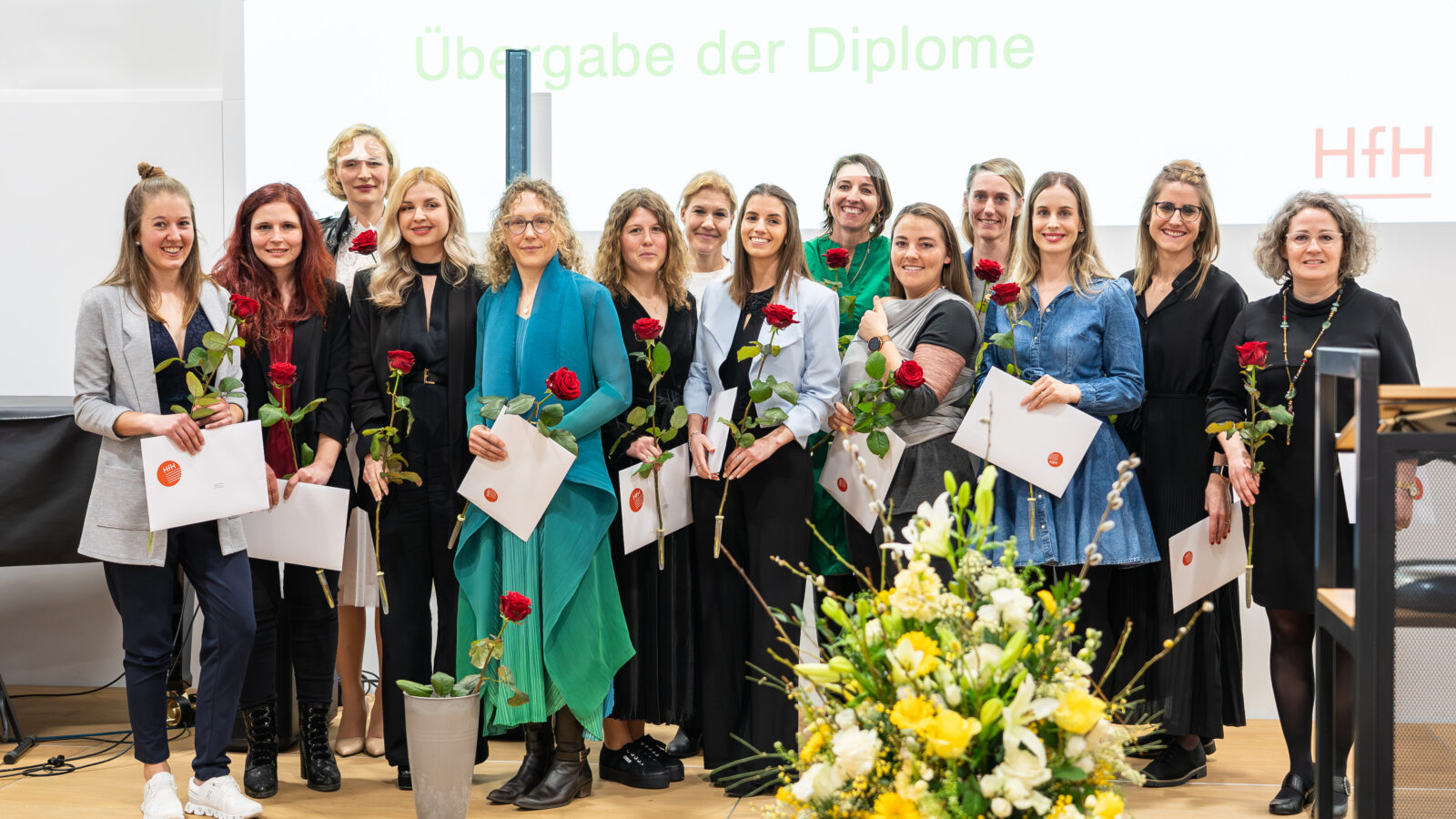In diesem Jahr durften 15 Absolventinnen des Masterstudiengangs Sonderpädagogik mit Vertiefung Schulische Heilpädagogik ihre Diplome samt Rosen in der Aula des Hochschulgebäudes Stella Maris entgegennehmen. «Nach all den Anstrengungen, die das Masterstudium den Diplomandinnen abverlangt hat, ist heute ein freudiger Tag, und er ist ein Meilenstein in ihrem Berufsleben, zu dem ich herzlich gratuliere», sagte Bea Zumwald. Auch Prof. Dr. Nicolas Robin, Prorektor Ausbildung der PHSG, überbrachte die besten Glückwünsche: «Erfolg, und vor allem der Weg zum Erfolg, sehen für jede und jeden von uns anders aus. Der Weg, den Sie bis zu diesem Tag zurückgelegt haben, ist ein Weg des Engagements, der Hingabe und des unermüdlichen Einsatzes, auf den Sie voller Stolz zurückblicken dürfen.» Stellvertretend für alle Absolventinnen liess eine Diplomandin anschliessend in einem kurzweiligen «Heldenepos» die Zeit des fünfsemestrigen Masterstudiums Revue passieren.