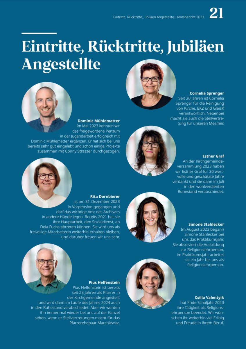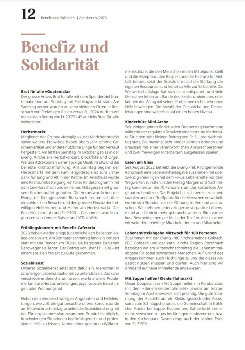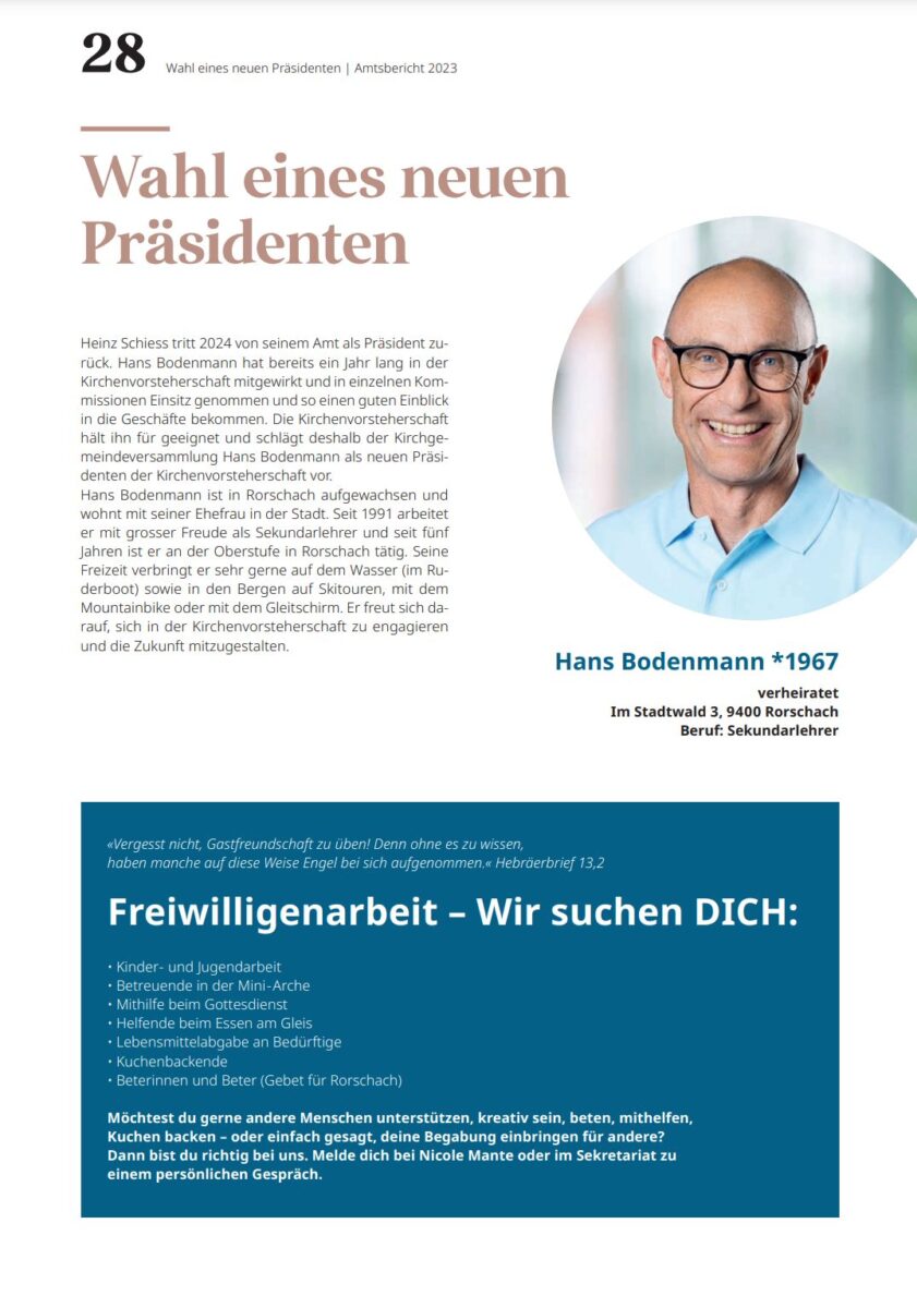 Der Gottesdienst beginnt am Sonntag um 10 Uhr, die Kirchbürgerversammlung um 11 Uhr. Haupttraktandum wird die Wahl eines neuen Präsidenten sein. Zur Wahl stellt sich Hans Bodenmann. Nachstehend Ausschnitte aus dem Amtsbericht 2023. Das Rorschacher Echo wird über die Versammlung am Montag berichten.