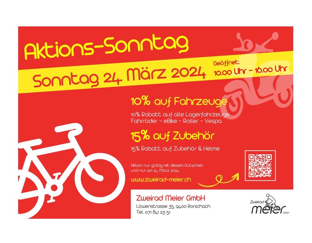 Die Zweirad-Meier GmbH lädt morgen Sonntag von 10 bis 17 Uhr zu einer speziellen Aktion an die Löwenstrasse 35 in Rorschach. Es winken interessante Rabatte.