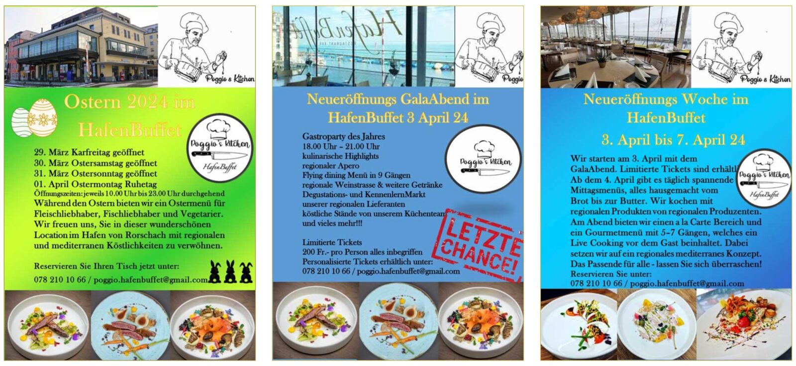 Jetzt kommt wieder etwas Bewegung in die Rorschacher Gastroszene. Die neuen Gastgeber Raphael und Vanessa öffnen das Hafenbuffet am Karfreitag (bis Ostersonntag) und starten die Woche nach Ostern die Events rund um die Neueröffnung. Die wichtigsten Details findet man auf den Flyern unten oder auf der Homepage.