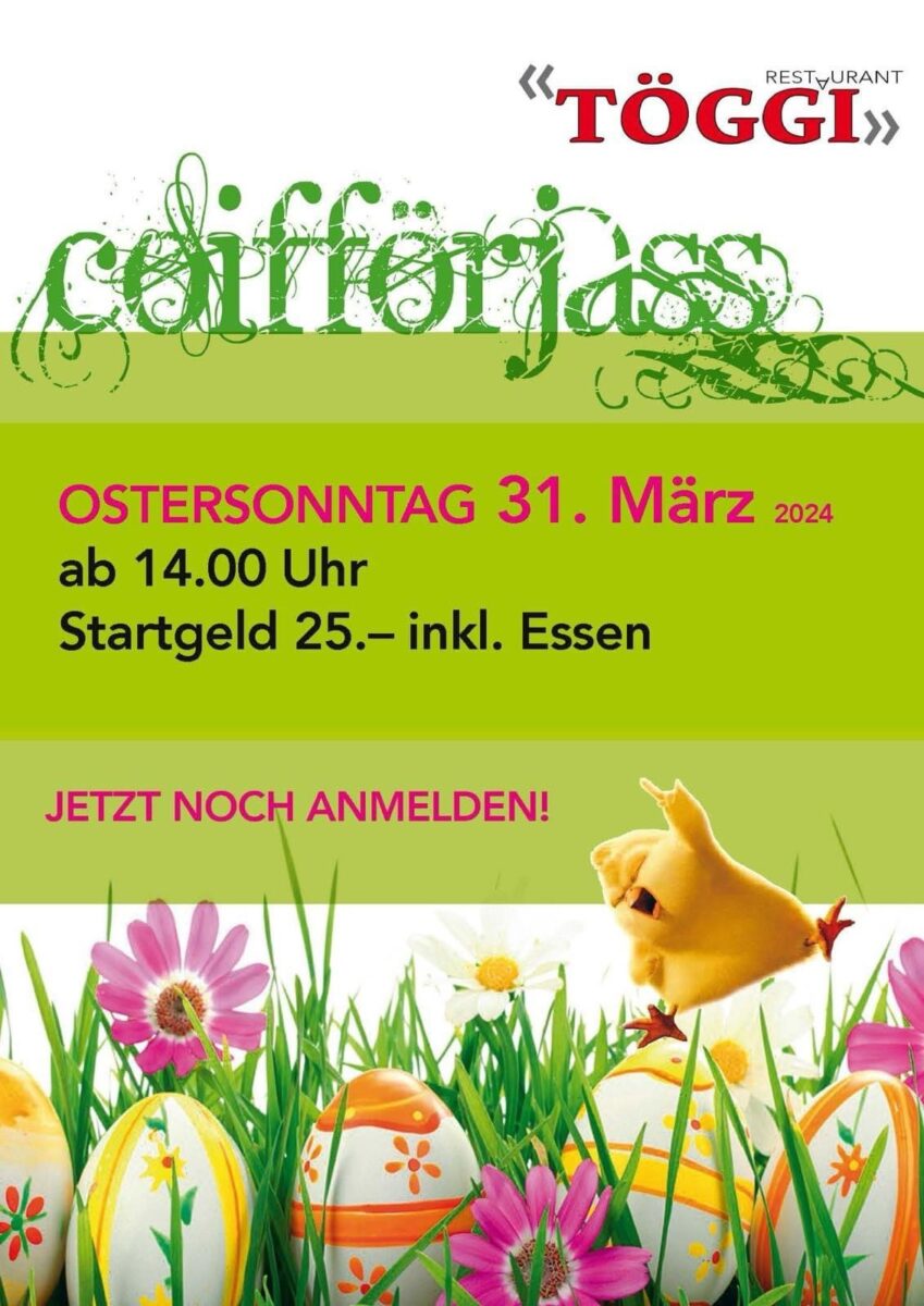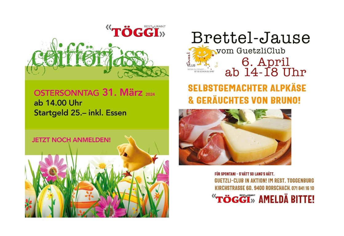 Die nächsten Highlights im Töggi in RorschachThemen:BeizenKulturRorschach 26. März 2024 - 05:30Für den „Coifförjass“ am Ostersonntag muss man sich bis kommenden Donnerstag direkt bei Marianne anmelden (Telefon: 071 841 16 10). Und ebenfalls anmelden muss man sich für die „Brettel-Jause“ vom Guetzli-Club am Samstag, 6. April 2024.Teilen mit: Einen Link per E-Mail an einen Freund senden (Wird in neuem Fenster geöffnet) E-Mail Drucken (Wird in neuem Fenster geöffnet) Drucken Auf Facebook teilen (Wird in neuem Fenster geöffnet) Facebook Auf X teilen (Wird in neuem Fenster geöffnet) X Auf WhatsApp teilen (Wird in neuem Fenster geöffnet) WhatsApp Gefällt mir:Gefällt mir Wird geladen …Newsletter abonnieren Bitte dieses Feld leer lassenBitte wähle, ob Du über jeden neuen Beitrag sofort oder lieber jeden Morgen gegen 9 Uhr eine Zusammenfassung der neusten Beiträge erhalten möchtest.Liste(n) auswählen: Neues vom Echo (Zusammenfassung) Neues vom Echo (Sofortbenachrichtigung) Dieses Feld wird benötigt.Prüfen Sie Ihren Posteingang und den Spamordner, um Ihr Abonnement zu bestätigen.