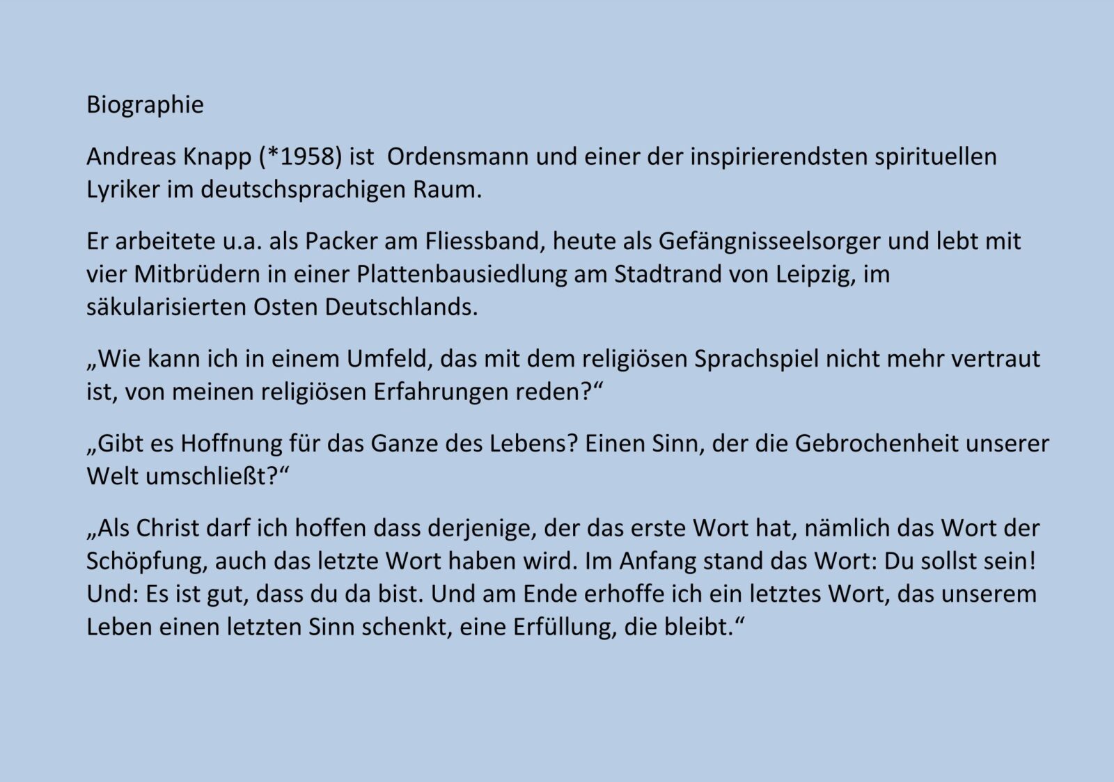 Justin Koller schreibt dazu: „Das Monatsgedicht nimmt das Thema Hoffnung an Ostern auf. Der Ordensmann Andreas Knapp schreibt lyrische Texte in einer Sprache für Menschen, die am Rande der Gesellschaft leben und wenig mit Religion zu tun haben. Durch sein soziales Engagement wirkt er authentisch. Ich wünsche frohe Festtage mit besinnlichen Momenten.“ (Gestaltung: Eigenkreation Justin Koller)
