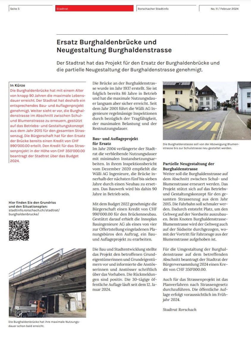 Die Bauarbeiten beginnen am 22. April 2024 und enden voraussichtlich am 18. Oktober 2024. Während der gesamten Bauzeit ist die Durchfahrt über die Burghaldenbrücke gesperrt. Die Umleitungsroute wird signalisiert. (Text: skr)