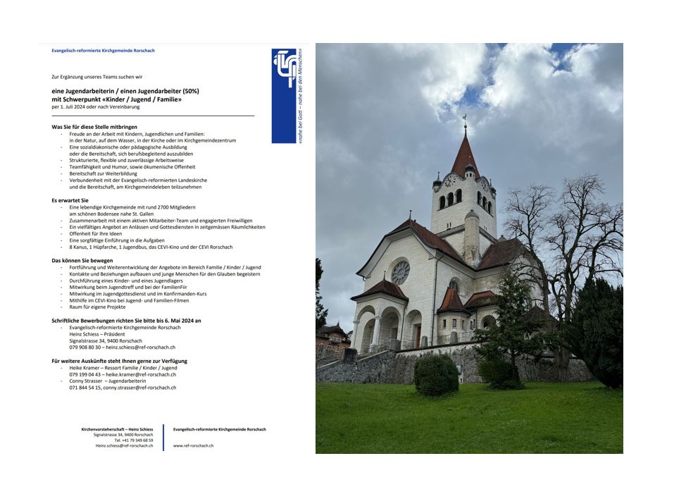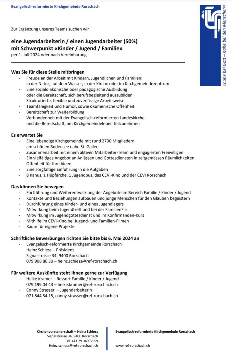 Ref. Rorschach sucht Fachkraft für die JugendarbeitThemen:PartnerRef. RorschachRorschach 10. April 2024 - 05:10Weitere Informationen zu dieser Stellenbeschreibung finden Interessierte hier.Teilen mit: Einen Link per E-Mail an einen Freund senden (Wird in neuem Fenster geöffnet) E-Mail Drucken (Wird in neuem Fenster geöffnet) Drucken Auf Facebook teilen (Wird in neuem Fenster geöffnet) Facebook Auf X teilen (Wird in neuem Fenster geöffnet) X Auf WhatsApp teilen (Wird in neuem Fenster geöffnet) WhatsApp Gefällt mir:Gefällt mir Wird geladen …Newsletter abonnieren Bitte dieses Feld leer lassenBitte wähle, ob Du über jeden neuen Beitrag sofort oder lieber jeden Morgen gegen 9 Uhr eine Zusammenfassung der neusten Beiträge erhalten möchtest.Liste(n) auswählen: Neues vom Echo (Zusammenfassung) Neues vom Echo (Sofortbenachrichtigung) Dieses Feld wird benötigt.Prüfen Sie Ihren Posteingang und den Spamordner, um Ihr Abonnement zu bestätigen.