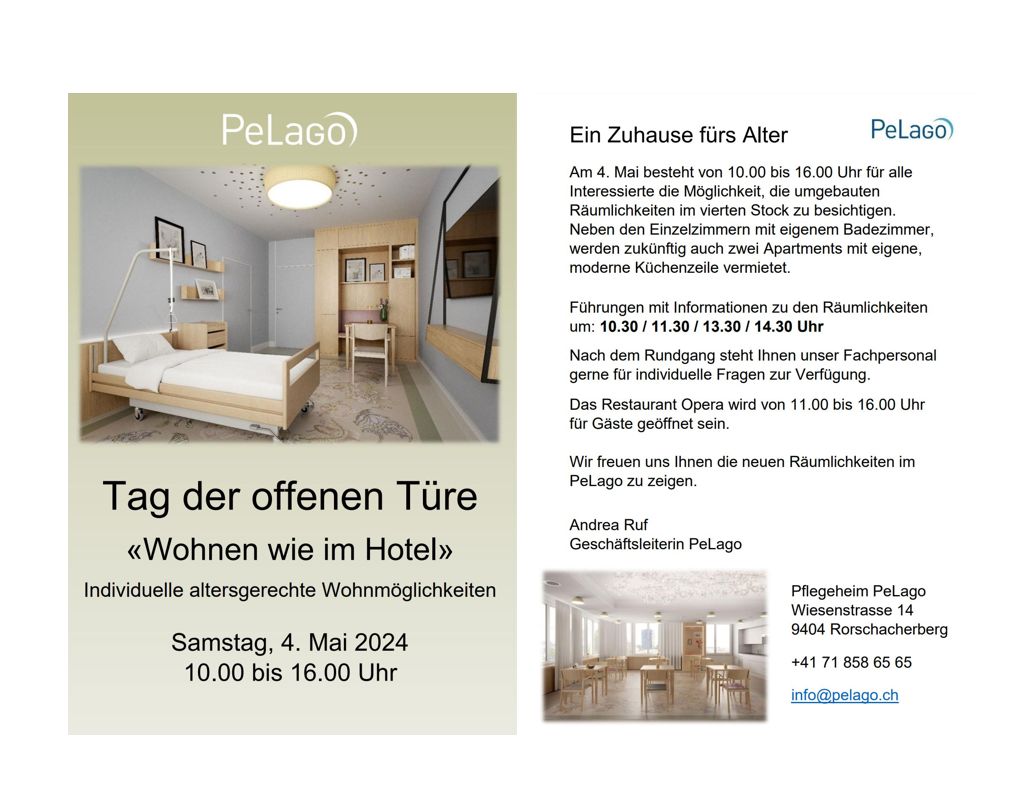 Anlässlich der Fertigstellung der frisch renovierten Zimmern und Apartments im vierten Stock des PeLagos hat die Leitung beschlossen, die Bevölkerung am Samstag, 4. Mai 2024, zur Besichtigung der individuellen altersgerechten Wohnmöglichkeiten einzuladen. Details findet man auf dem Flyer unten.