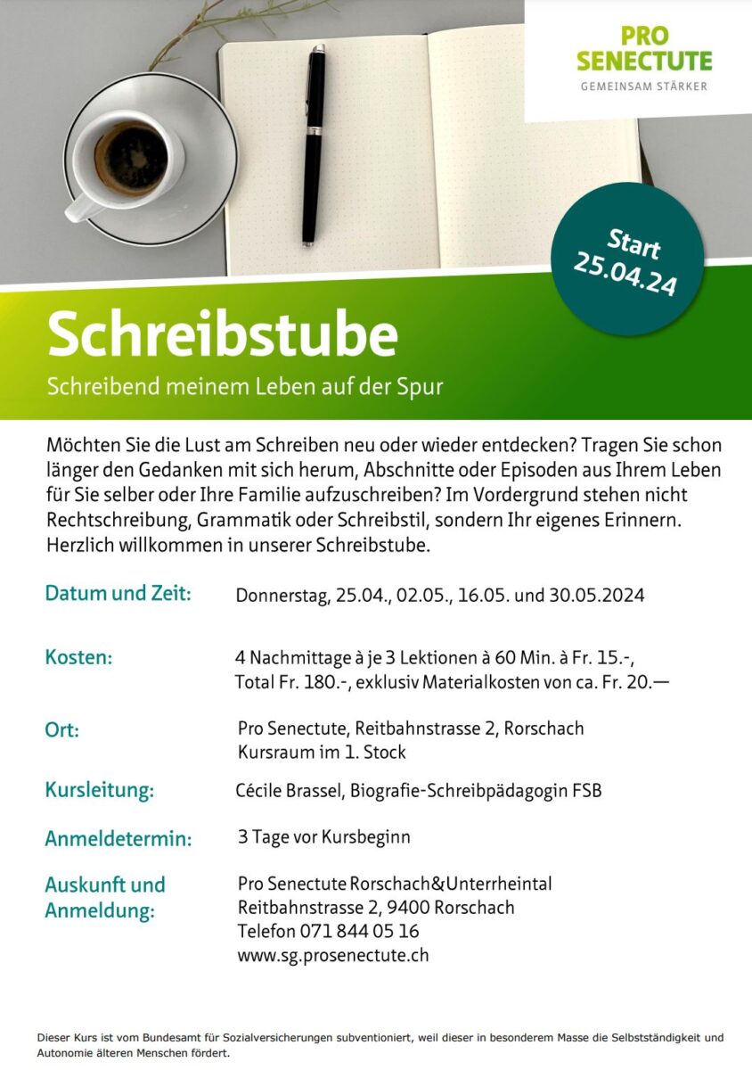 Ein weiteres Kursangebot der Pro Senectute RorschachThemen:KulturRorschach 21. April 2024 - 05:37Wer an dieser „Schreibstube“ teilnehmen will muss sich aber rasch anmelden.Teilen mit: Einen Link per E-Mail an einen Freund senden (Wird in neuem Fenster geöffnet) E-Mail Drucken (Wird in neuem Fenster geöffnet) Drucken Auf Facebook teilen (Wird in neuem Fenster geöffnet) Facebook Auf X teilen (Wird in neuem Fenster geöffnet) X Auf WhatsApp teilen (Wird in neuem Fenster geöffnet) WhatsApp Gefällt mir:Gefällt mir Wird geladen …Newsletter abonnieren Bitte dieses Feld leer lassenBitte wähle, ob Du über jeden neuen Beitrag sofort oder lieber jeden Morgen gegen 9 Uhr eine Zusammenfassung der neusten Beiträge erhalten möchtest.Liste(n) auswählen: Neues vom Echo (Zusammenfassung) Neues vom Echo (Sofortbenachrichtigung) Dieses Feld wird benötigt.Prüfen Sie Ihren Posteingang und den Spamordner, um Ihr Abonnement zu bestätigen.