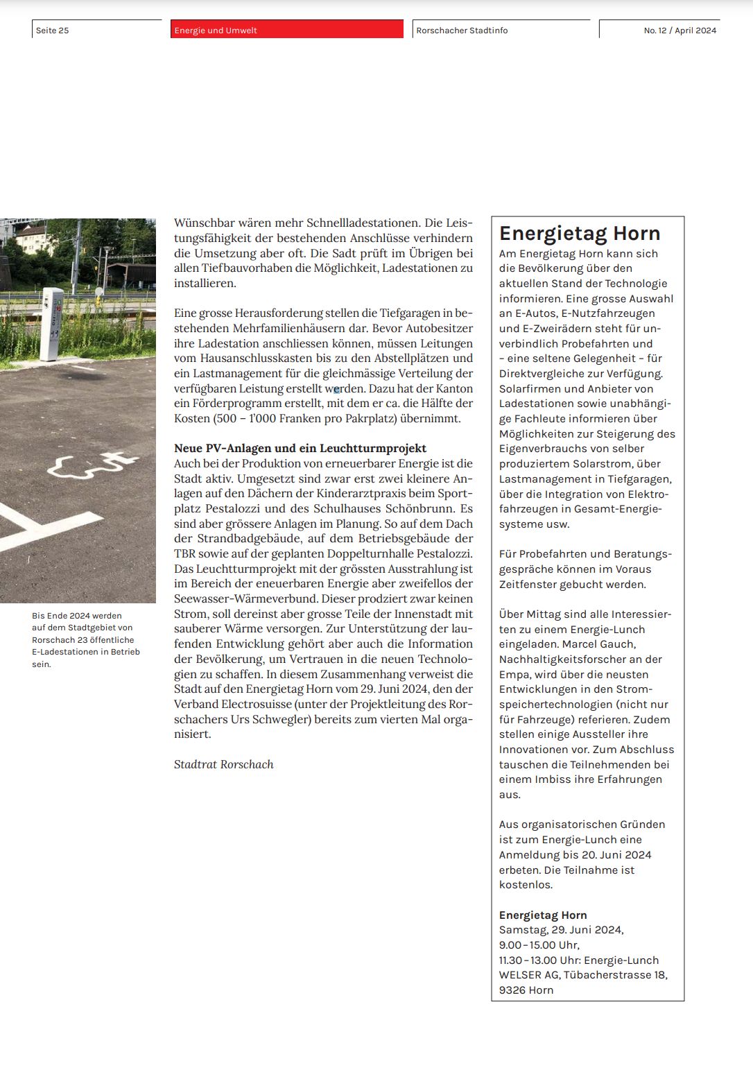 Stadt Rorschach bereitet sich auf Elektromobilität vorThemen:Rorschach 1. Mai 2024 - 05:05In den aktuellen Rorschacher Stadtinfos auf den Seiten 24 und 25. Teilen mit: Einen Link per E-Mail an einen Freund senden (Wird in neuem Fenster geöffnet) E-Mail Drucken (Wird in neuem Fenster geöffnet) Drucken Auf Facebook teilen (Wird in neuem Fenster geöffnet) Facebook Auf X teilen (Wird in neuem Fenster geöffnet) X Auf WhatsApp teilen (Wird in neuem Fenster geöffnet) WhatsApp Gefällt mir:Gefällt mir Wird geladen …Newsletter abonnieren Bitte dieses Feld leer lassenBitte wähle, ob Du über jeden neuen Beitrag sofort oder lieber jeden Morgen gegen 9 Uhr eine Zusammenfassung der neusten Beiträge erhalten möchtest.Liste(n) auswählen: Neues vom Echo (Zusammenfassung) Neues vom Echo (Sofortbenachrichtigung) Dieses Feld wird benötigt.Prüfen Sie Ihren Posteingang und den Spamordner, um Ihr Abonnement zu bestätigen.
