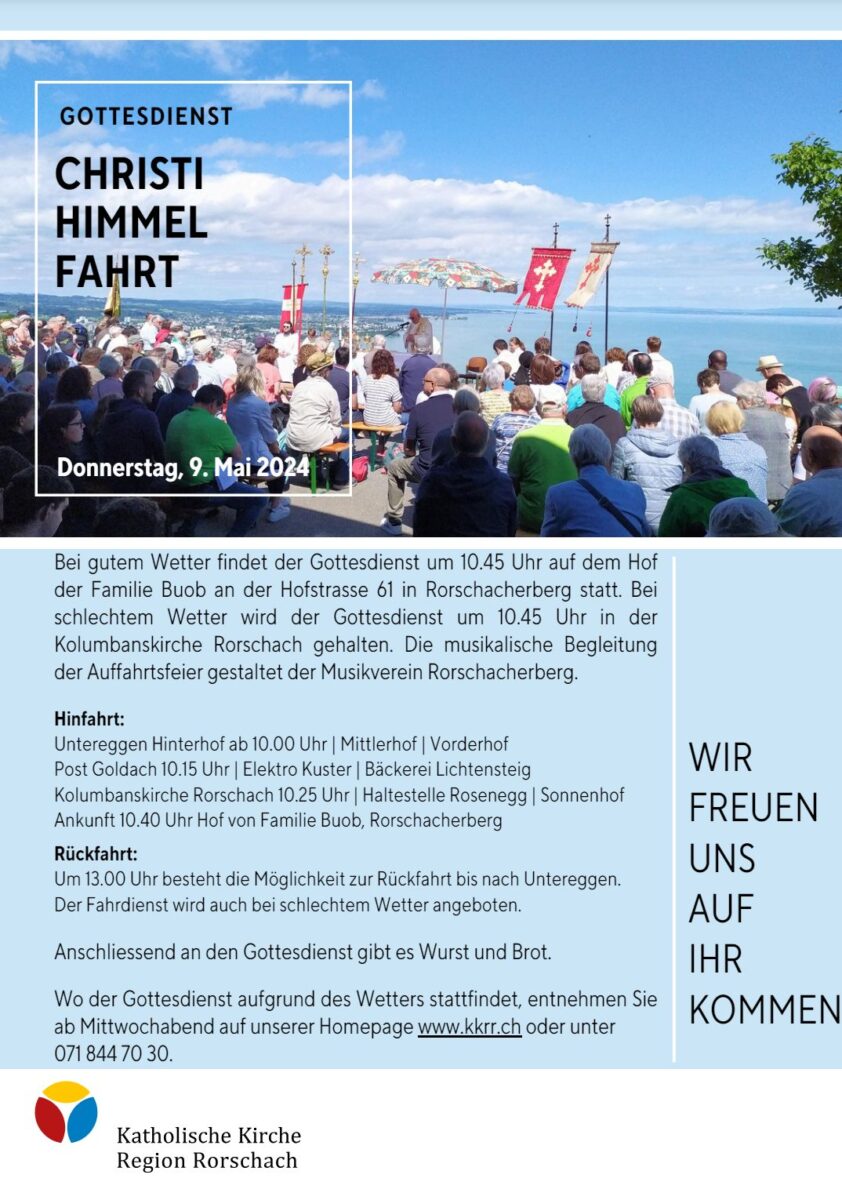 Heute Donnerstag wird Christi Himmelfahrt gefeiert. Die Katholische Kirche der Region Rorschach bietet eine ganz spezielle Feier an. Der Gottesdienst findet definitiv um 10.45 Uhr auf dem Hof der Familie Buob, Hofstrasse 61, in Rorschacherberg statt. Warme Kleidung ist empfehlenswert. Details findet man auf dem Flyer unten.