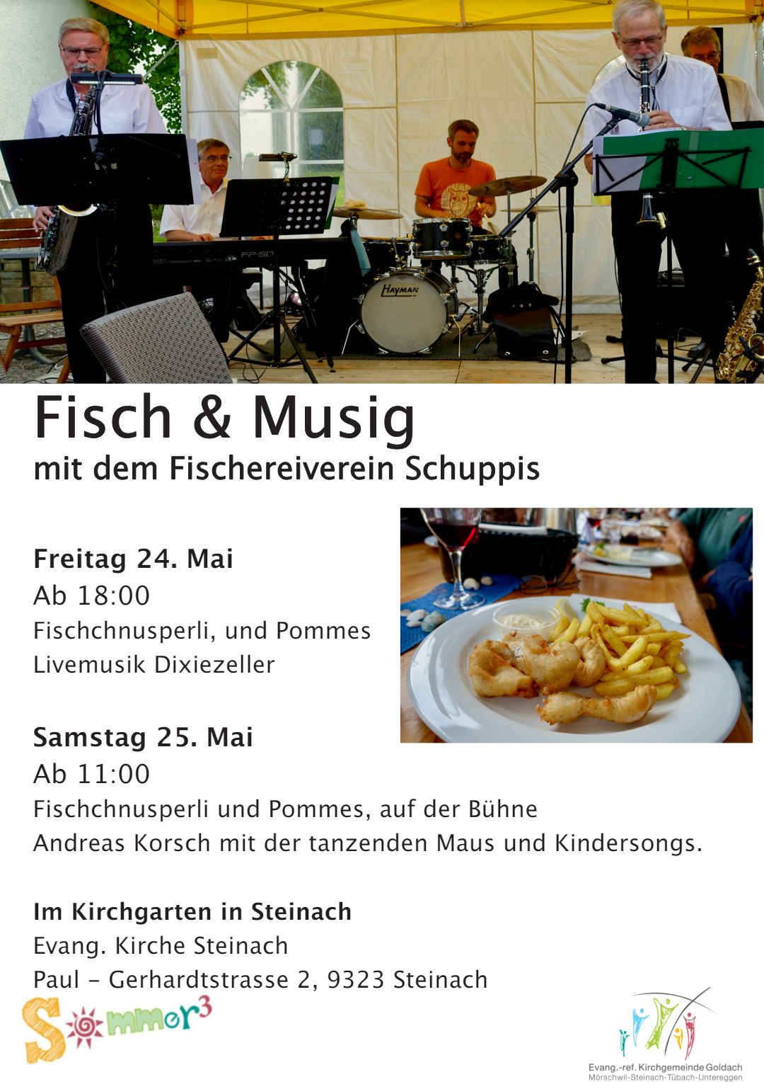 Morgen Freitagabend und tags darauf am Samstagmittag bereitet der Fischereiverein Schuppis Fischchnusperli und Pommes zu. Freitags 18 Uhr, samstags 11 Uhr ist die Fischbeiz bei der evangelische Kirche Steinach geöffnet. Am Freitag gibt es dazu Livemusik «Dixizeller» mit heiterer, fetziger, geschichtsträchtiger und trotzdem zeitloser Dixieland-Musik.