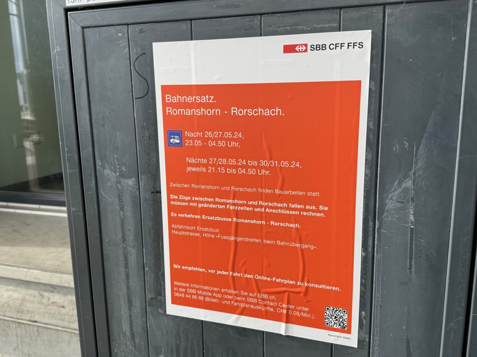 Ab diesem Wochenende ist in Rorschach auch einiges an Improvisationstalent gefragt. Nachdem wegen dem Hangrutsch in Mörschwil bereits die St.Galler-Linie beeinträchtigt ist, müssen ab der Nacht von Sonntag auf Montag auch ÖV-Nutzer:innen auf der Seelinie mit Einschränkungen und Ersatzbussen rechnen. Arbeiten dieser Art verlangen eine lange Verlaufszeit. Zum Glück liegen diese zumindest in der Nacht. Die Plakate sind gut sichtbar am Hafenbahnhof in Rorschach ausgehängt. Die SBB empfehlen, den Online-Fahrplan oder der SBB Mobile App anzuschauen. (Planskizze: pd sbb)