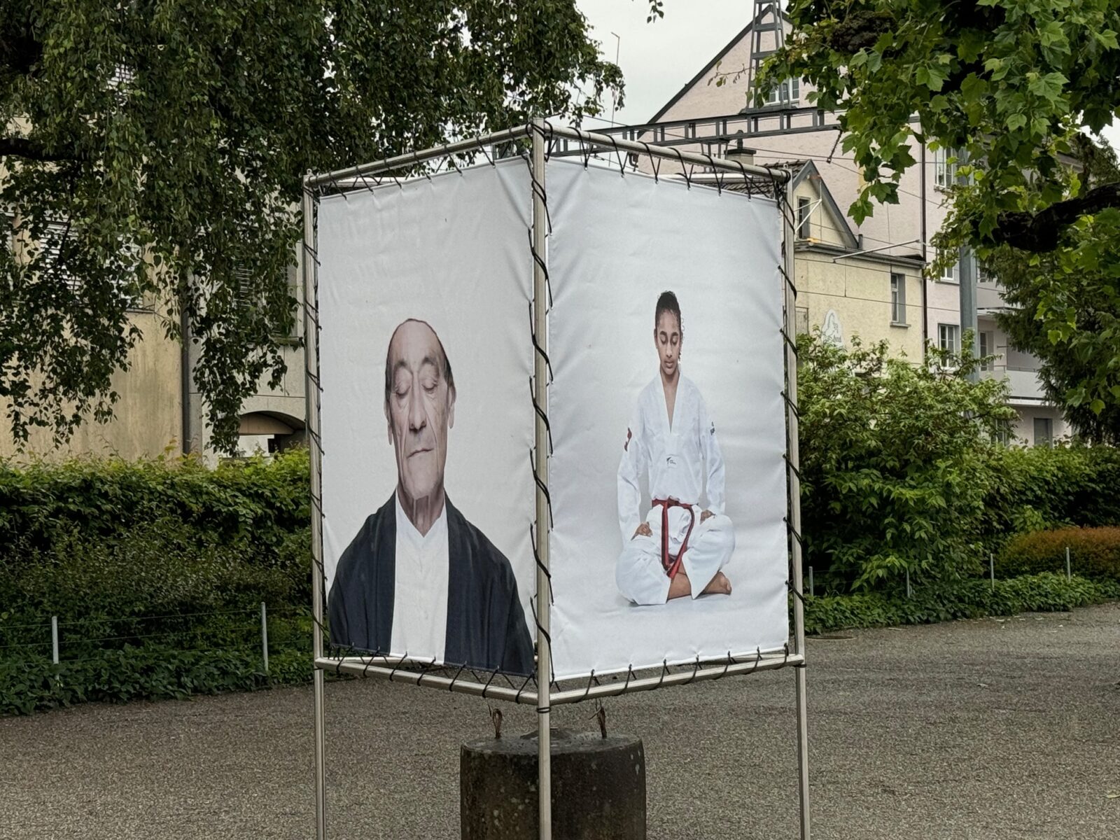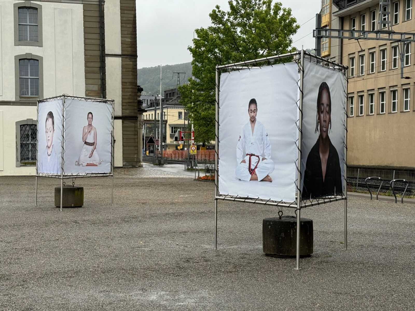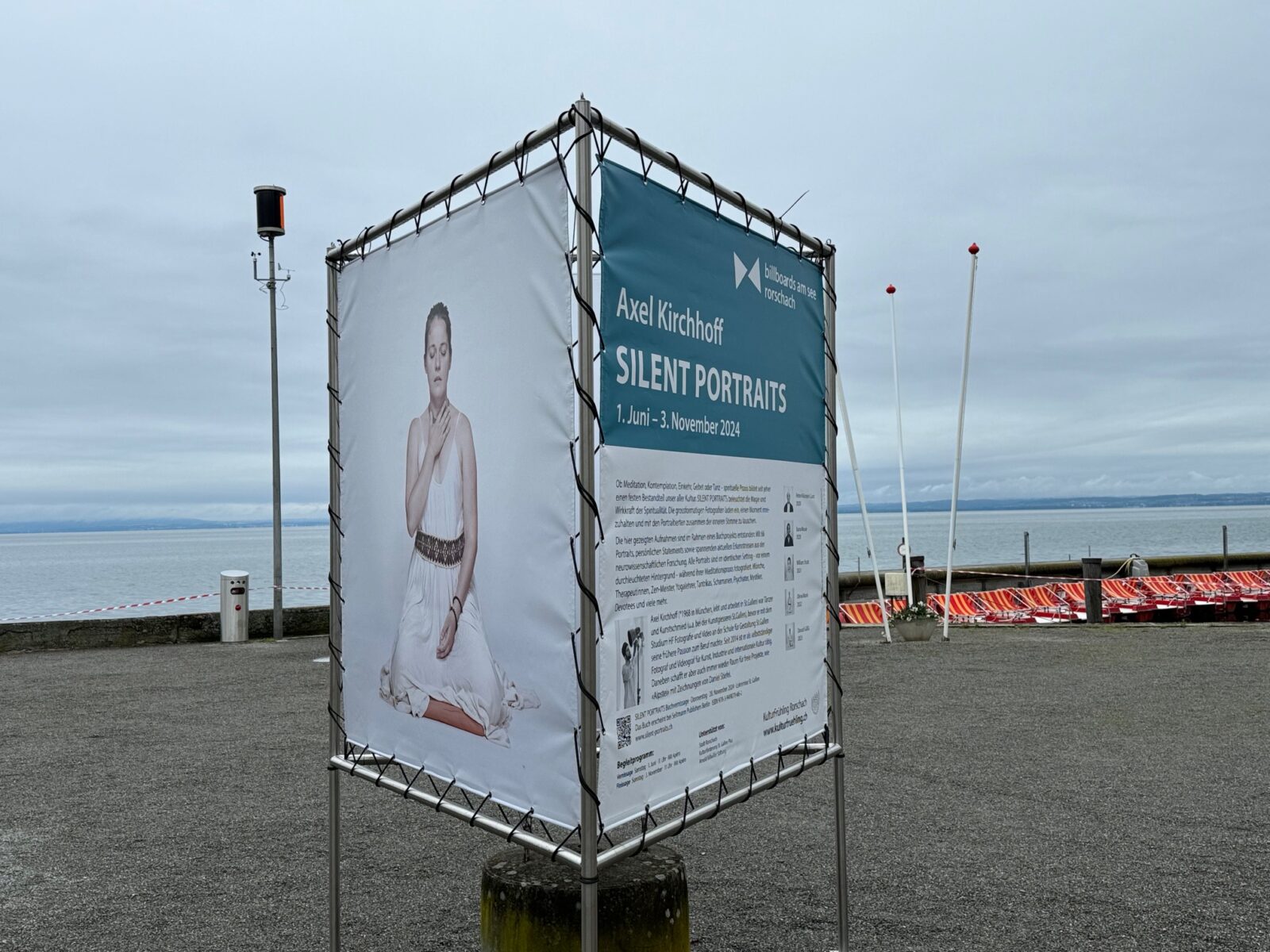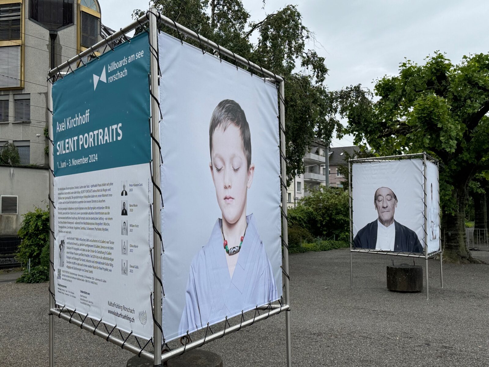 Seit Samstag ist die Kornhaus-Westseite auch wieder künstlerisch belebt. Die 5. Ausgabe der «Billboards am See» ist der Magie und Wirkkraft der Spiritualität gewidmet. Ob Meditation, Kontemplation, Einkehr, Gebet oder Tanz – spirituelle Praxis bildet seit jeher einen festen Bestandteil unser aller Kultur. Insgesamt 66 Menschen hat Axel Kirchhoff für sein Buchprojekt SILENT PORTRAITS während ihrer Meditationspraxis fotografiert. Fünf ausgewählte Portraits als grossformatige Fotografien im öffentlichen Raum laden die Passant:innen ein, einen Moment innezuhalten und mit den Portraitierten zusammen über die eigene Spiritualität nachzudenken. Die Kulturfrühling-Installation steht bis am 3. November 2024. Und so präsentiert sich das Ganze: