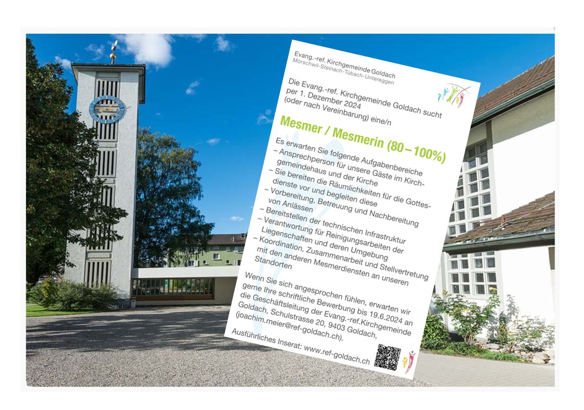 Die Evang.-ref. Kirchgemeinde Goldach sucht per 1. Dezember 2024 (oder nach Vereinbarung) eine/n Mesmerin / Mesmer (80 – 100%). Mehr Infos findet man auf dem Flyer unten oder auf der Homepage. Allfällige Fragen beantwortet Geschäftsleiter Joachim Meier, 071 846 89 01, joachim.meier@ref-goldach.ch.