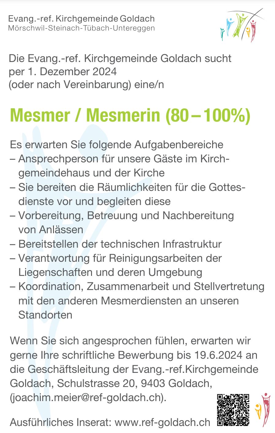 Die Evang.-ref. Kirchgemeinde Goldach sucht per 1. Dezember 2024 (oder nach Vereinbarung) eine/n Mesmerin / Mesmer (80 – 100%). Mehr Infos findet man auf dem Flyer unten oder auf der Homepage. Allfällige Fragen beantwortet Geschäftsleiter Joachim Meier, 071 846 89 01, joachim.meier@ref-goldach.ch.