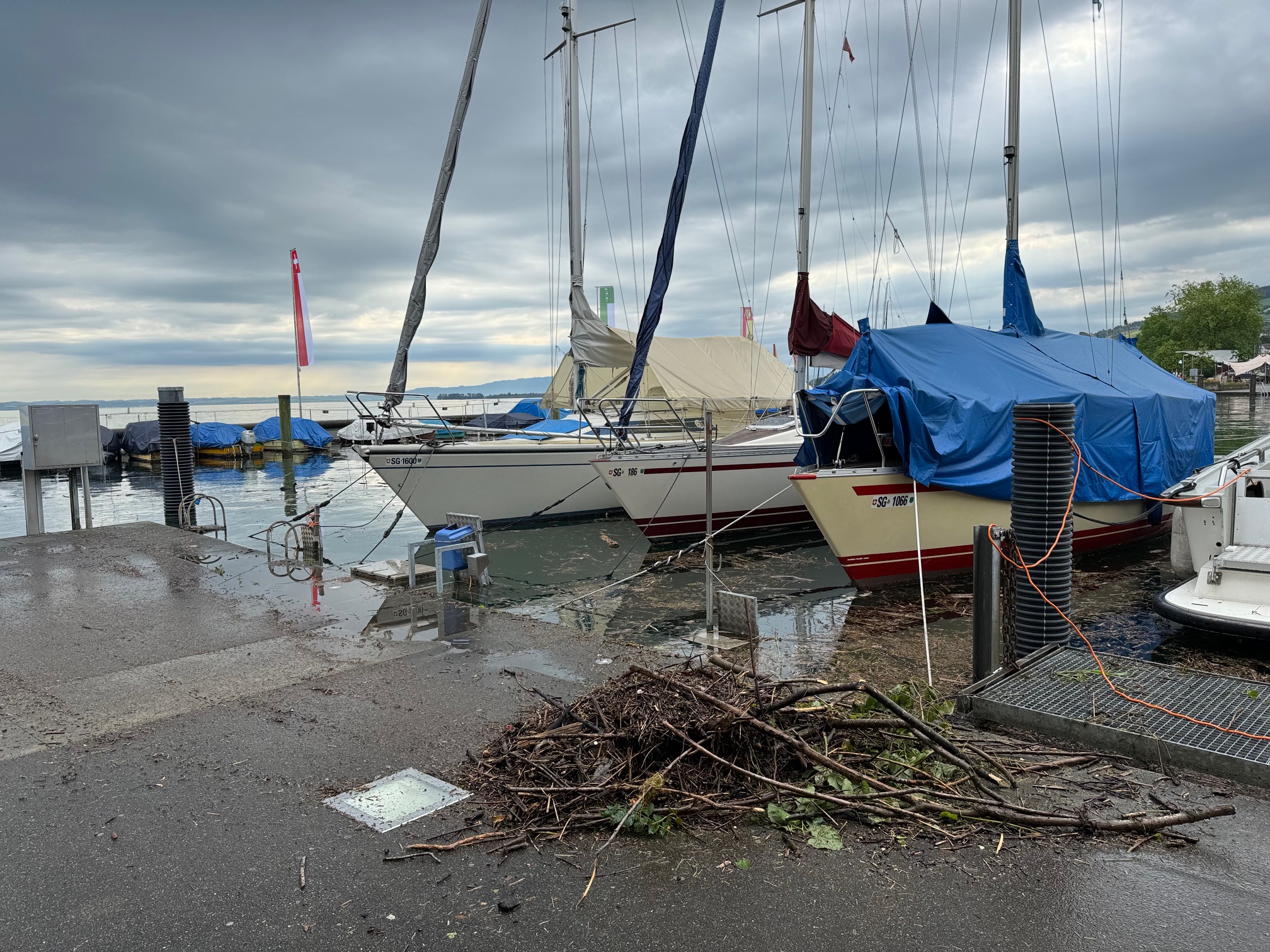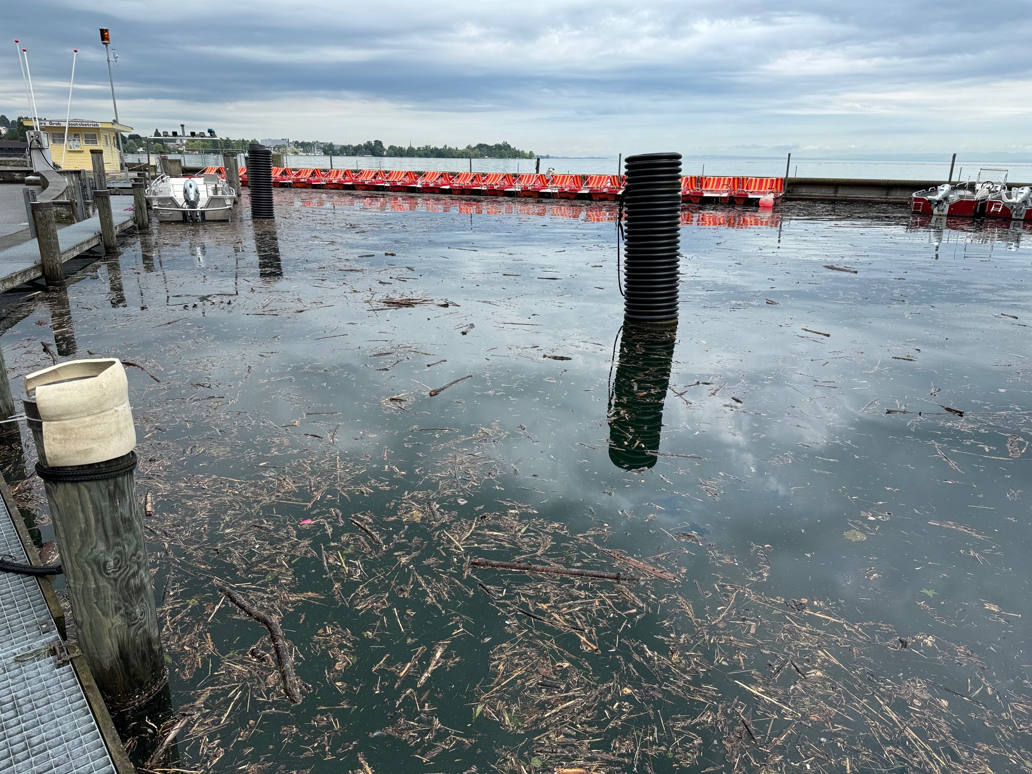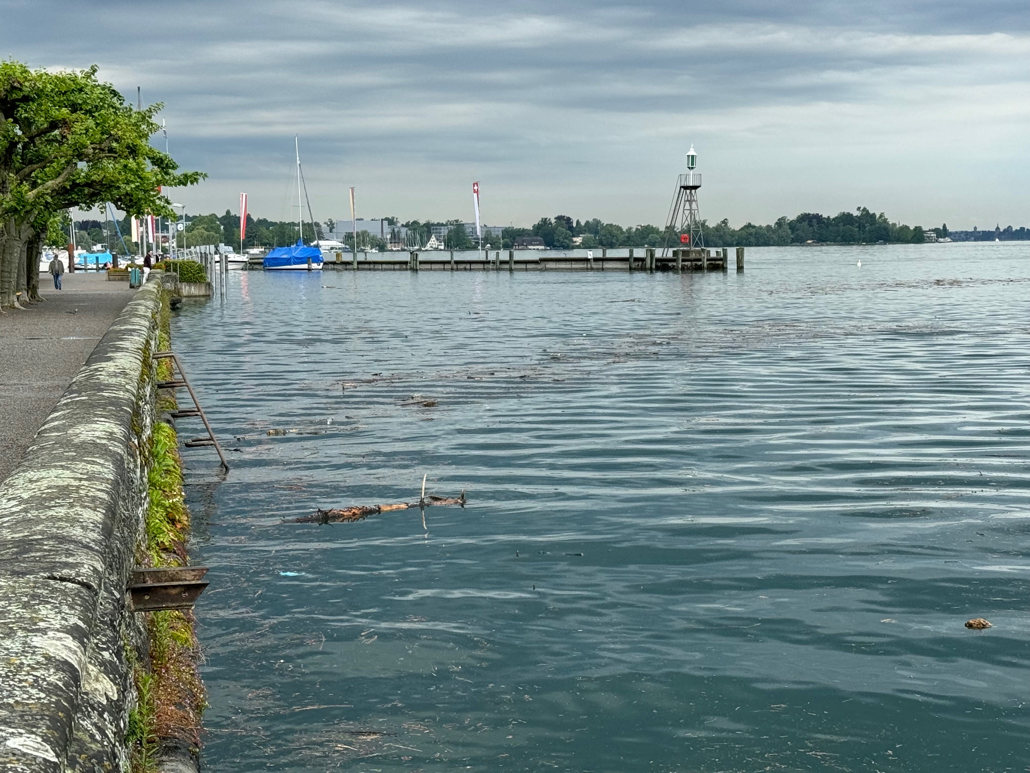 Kurz vor Mittag meldet die Messstation heute einen gleichbleibend hohen Seepegel von 397.14 Meter über Meer (MüM). Und die Wetterprognosen sagen weitere Niederschläge voraus. Man muss das Ganze weiterhin im Auge behalten. Zudem ist heute viel Schwemmholz im Rorschacher Hafen auszumachen. Ein Mitarbeiter versucht, das Ganze in einem erträglichen Mass zu halten. Hier Bilder von heute Freitagvormittag.