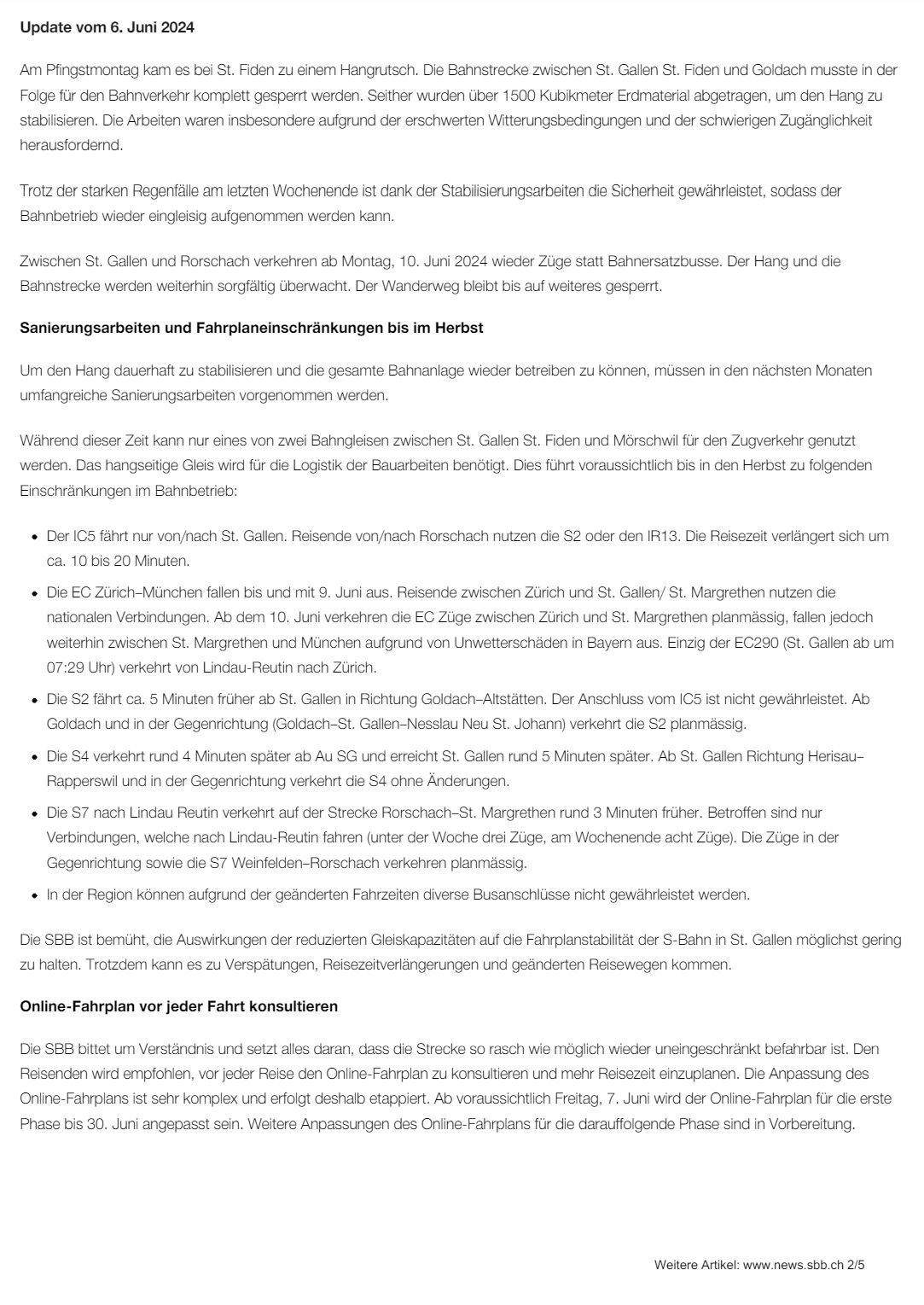 Wie der Pressedienst der SBB bereits am Donnerstag gemeldet hat, ist die Bahnstrecke St. Fiden–Goldach ab 10. Juni wieder offen. Nach intensiven Bauarbeiten und der Stabilisierung des Hangs kann die SBB den Bahnbetrieb zwischen St. Gallen und Rorschach kommenden Montag wieder aufnehmen. Aufgrund der erforderlichen Sanierungsarbeiten kann der Bahnverkehr bis im Herbst nur eingleisig geführt werden. Es kommt zu Fahrplaneinschränkungen. Einige betreffen Rorschach stark: Der IC5 fährt vorderhand nicht ab Rorschach und bei den Regionalzügen ändern sich zum Teil die Abfahrtszeiten. Es wird empfohlen, den Online-Fahrplan zu konsultieren. (Beitragsbild/Infoblatt: pd sbb)