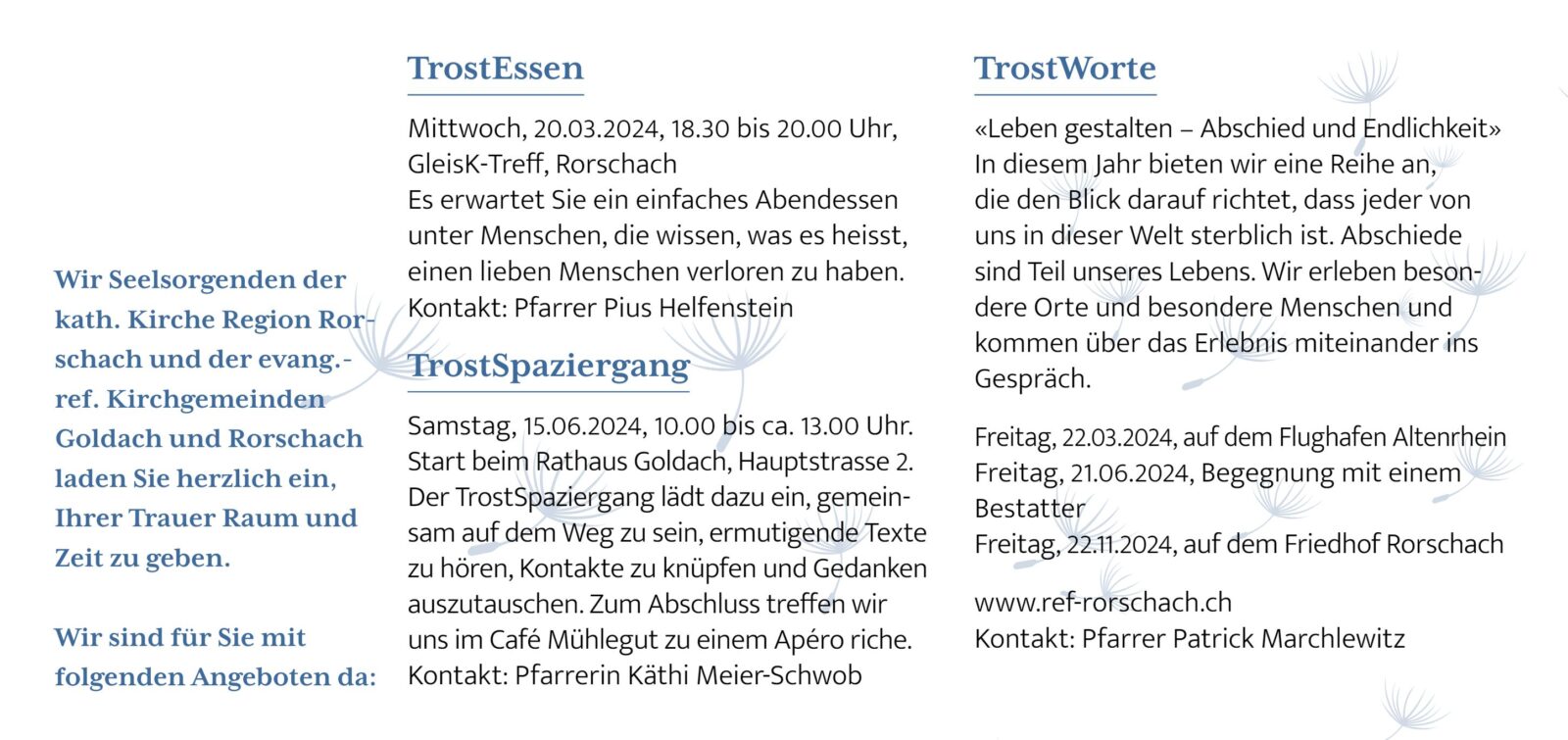 Zum kommenden „TrostSpaziergang“ schreiben die Initiant:innen: „Gemeinsam auf dem Weg sein – Orte der Erinnerung aufsuchen – ermutigende Texte hören − Kontakte knüpfen und Gedanken austauschen – sich gemeinsam für den weiteren Weg stärken … dazu bietet der TrostSpaziergang Gelegenheit. Zum Abschluss des Spazierganges treffen wir uns zu einem Apéro riche im Café Mühlegut. Eine vorgängige Anmeldung ist erwünscht, aber nicht zwingend.