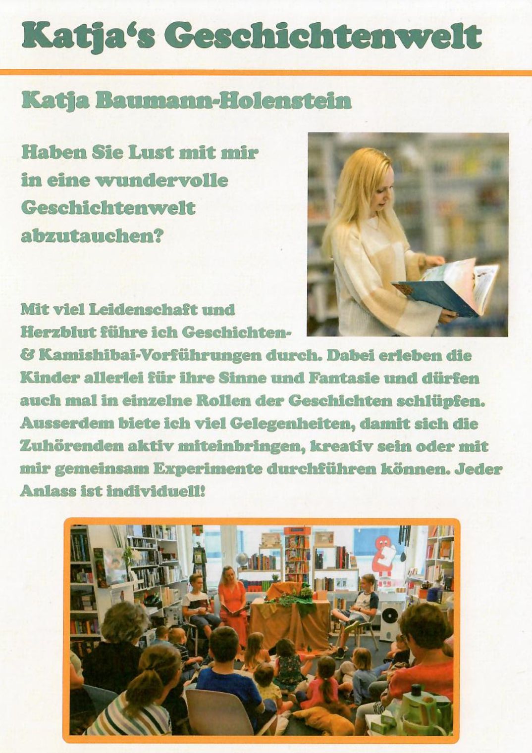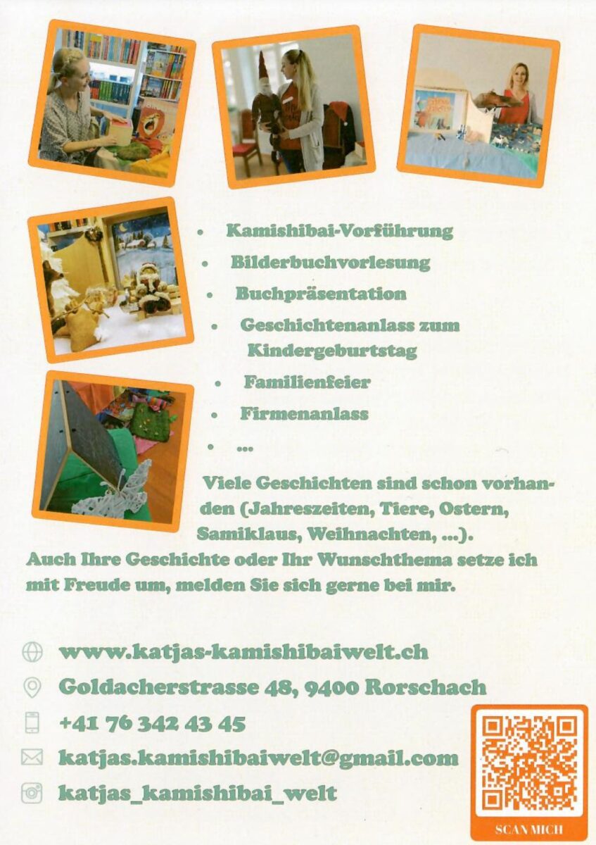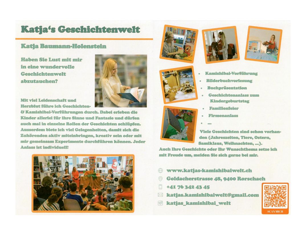 Die Rorschacherin Katja Baumann-Holenstein ist für ihre Erzählkünste bei den Kids in der ganzen Region bekannt. Ihre Auftritte immer am letzten Mittwochnachmittag des Monats in der Buchhandlung WörterSpiel sind heiss begehrt. Ein Blick auf ihre Homepage zeigt, was man tun kann, um mit Kindern in ihre wundervolle Geschichtenwelt abzutauchen. Und direkt mit ihr in Kontakt treten kann man hier.