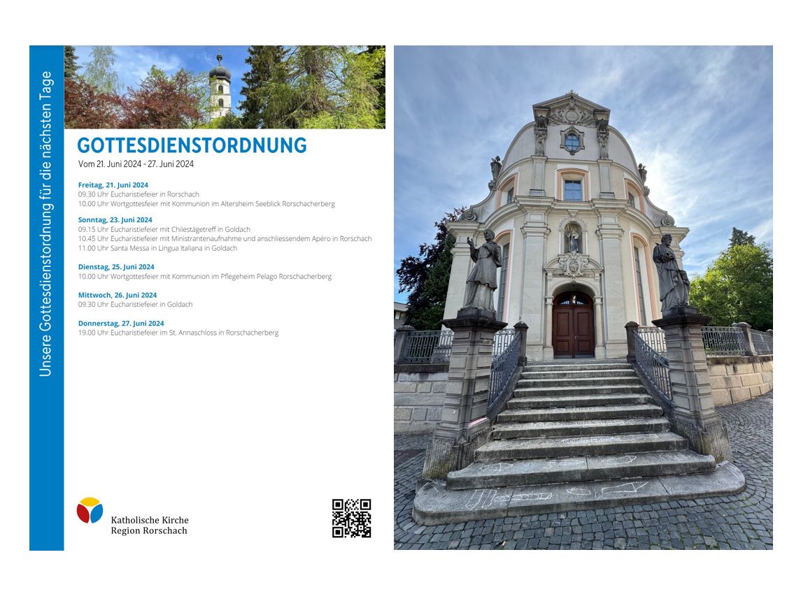 Gottesdienstordnung der KKRR für die nächsten TageThemen:Kath. RorschachKulturPartnerRegionRorschach 21. Juni 2024 - 05:15Gilt ab heute Freitag bis kommenden Donnerstag, 27. Juni 2024. Mehr Informationen finden Interessierte immer auch hier und hier.Teilen mit: Einen Link per E-Mail an einen Freund senden (Wird in neuem Fenster geöffnet) E-Mail Drucken (Wird in neuem Fenster geöffnet) Drucken Auf Facebook teilen (Wird in neuem Fenster geöffnet) Facebook Auf X teilen (Wird in neuem Fenster geöffnet) X Auf WhatsApp teilen (Wird in neuem Fenster geöffnet) WhatsApp Gefällt mir:Gefällt mir Wird geladen …Newsletter abonnieren Bitte dieses Feld leer lassenBitte wähle, ob Du über jeden neuen Beitrag sofort oder lieber jeden Morgen gegen 9 Uhr eine Zusammenfassung der neusten Beiträge erhalten möchtest.Liste(n) auswählen: Neues vom Echo (Zusammenfassung) Neues vom Echo (Sofortbenachrichtigung) Dieses Feld wird benötigt.Prüfen Sie Ihren Posteingang und den Spamordner, um Ihr Abonnement zu bestätigen.