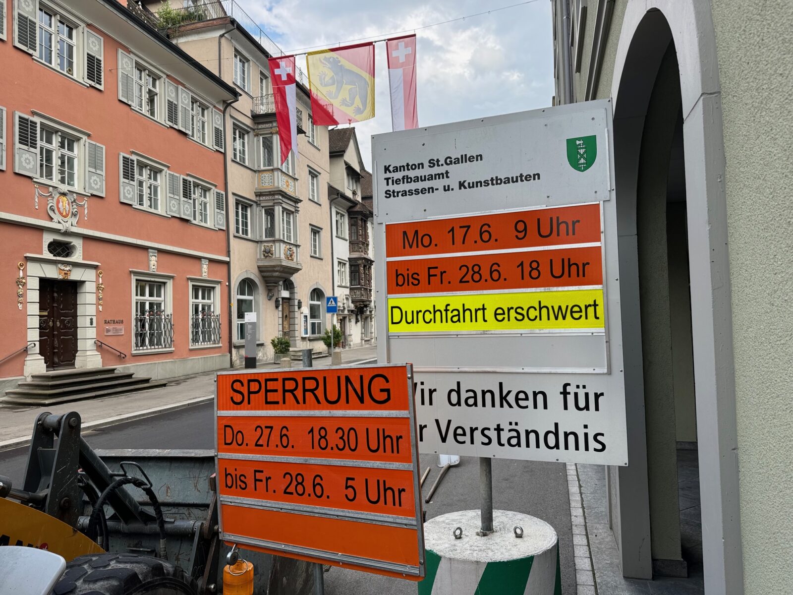 Wegen des Regens konnte an der Hauptstrasse der Einbau des Deckbelags im Abschnitt zwischen Hafen und Bodan nicht wie geplant in der Nacht von Dienstag, 25. Juni, auf Mittwoch, 26. Juni, stattfinden. Die Arbeiten sind nun auf die Nacht von morgen Donnerstag, 27. Juni, auf Freitag, 28. Juni, verschoben, sofern das Wetter mitspielt. (Text: pd sk)