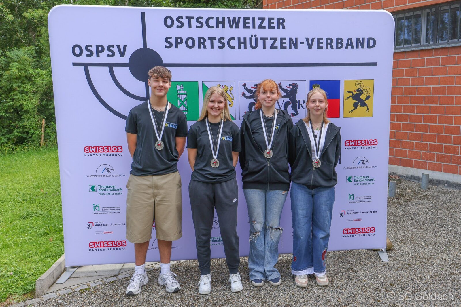Der Ostschweizerische Sportschützenverband führt jedes Jahr einen Nachwuchs-Gruppenwettkampf 2-Stellung durch. Auch die Schützengesellschaft Goldach war mit einer Gruppe vertreten. Zwei Schützen mussten jeweils zwanzig Schuss kniend und zwei Schützen zwanzig Schuss liegend absolvieren. Es mussten total drei Heimrunden geschossen werden. Die besten neun Gruppen qualifizieren sich jeweils für den Final. Dieser fand dann in Goldach statt. Bei schwierigen Bedingungen, steter Lichtwechsel vor allem in der zweiten Runde des Wettkampfes, wurde am frühen Samstagmorgen gestartet. Jede Gruppe musste den Wettkampf zweimal absolvieren, wobei nach dem ersten Durchgang die Scheiben gewechselt wurden. Dank der modernen Anlage war jeder Zeit ersichtlich, welche Gruppe gerade die Nase vorn hatte. Erfreulich war, dass sich die Gruppe aus Goldach stets in der vorderen Ranglistenhälfte befand. So wurden die beiden Kniendschützen Ronja Blattner 201.5 / 192.9 und Samuel Balgar 184.5 / 177.0 und die beiden Liegendschützen Nina Beerle 196.0 / 19193.0 und Mia Blattner 184.2 / 191.0 mit total 1518.6 Punkten den sehr guten zweiten Schlussrang belegten. Die Schützengesellschaft Goldach gratuliert ihrem Nachwuchs recht herzlich zu den erzielten Resultaten. bh