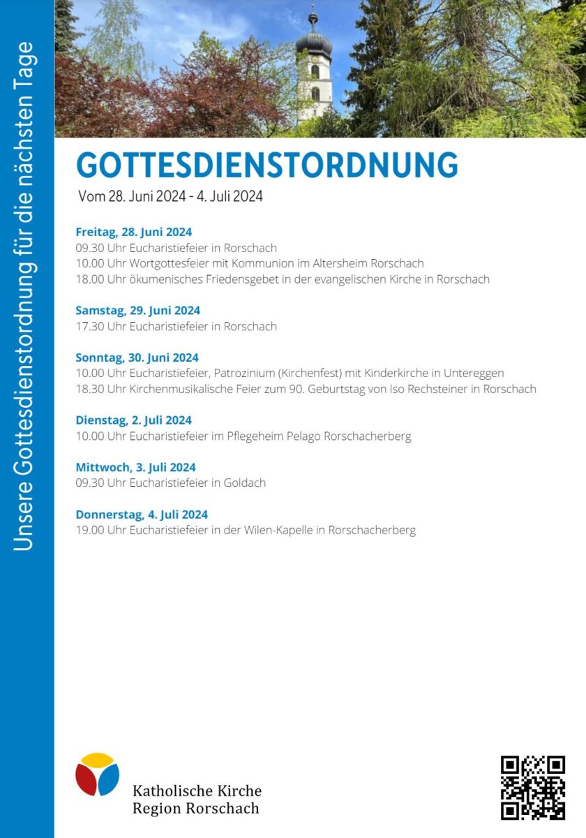 Gottesdienstordnung der KKRR für die nächsten TageThemen:Kath. RorschachKulturPartnerRegionRorschach 28. Juni 2024 - 05:20Gilt ab heute Freitag bis kommenden Donnerstag, 4. Juli 2024. Mehr Informationen finden Interessierte immer auch hier und hier.Teilen mit: Einen Link per E-Mail an einen Freund senden (Wird in neuem Fenster geöffnet) E-Mail Drucken (Wird in neuem Fenster geöffnet) Drucken Auf Facebook teilen (Wird in neuem Fenster geöffnet) Facebook Auf X teilen (Wird in neuem Fenster geöffnet) X Auf WhatsApp teilen (Wird in neuem Fenster geöffnet) WhatsApp Gefällt mir:Gefällt mir Wird geladen …Newsletter abonnieren Bitte dieses Feld leer lassenBitte wähle, ob Du über jeden neuen Beitrag sofort oder lieber jeden Morgen gegen 9 Uhr eine Zusammenfassung der neusten Beiträge erhalten möchtest.Liste(n) auswählen: Neues vom Echo (Zusammenfassung) Neues vom Echo (Sofortbenachrichtigung) Dieses Feld wird benötigt.Prüfen Sie Ihren Posteingang und den Spamordner, um Ihr Abonnement zu bestätigen.