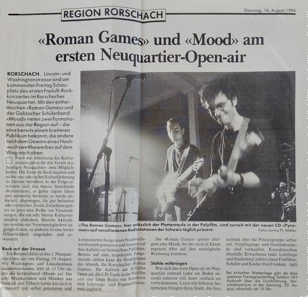 Das geht aus einem Zeitungsartikel vom 16. August 1994 hervor, den Peter Niedermaier, Keyboarder der Roman Games, in seinem Bandarchiv gefunden hat. Das Fest fand damals an der Ecke Lincoln- und Washingtonstrasse statt und man versprach sich viel von den vier jungen Rorschachern: “Ihr Auftritt am Open Air St. Gallen, die CD-Taufe in der Polyfilm und eine lange Reihe von Konzerten sind Leistungs- und Popularitätsausweis zugleich,” heisst es im Artikel.