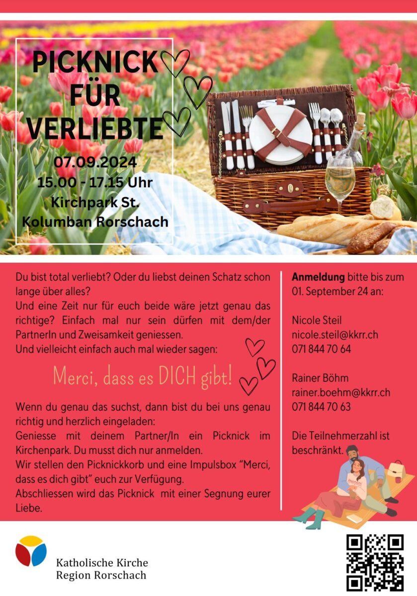 Wenn du genau das suchst, dann bist du bei uns richtig und herzlich eingeladen: Geniesse mit deinem Partner/In ein Picknick im Kirchenpark. Du musst dich nur anmelden. Wir stellen den Picknickkorb und eine Impulsbox «Merci, dass es dich gibt» euch zur Verfügung. Abschliessen wird das Picknick mit einer Segnung eurer Liebe.“