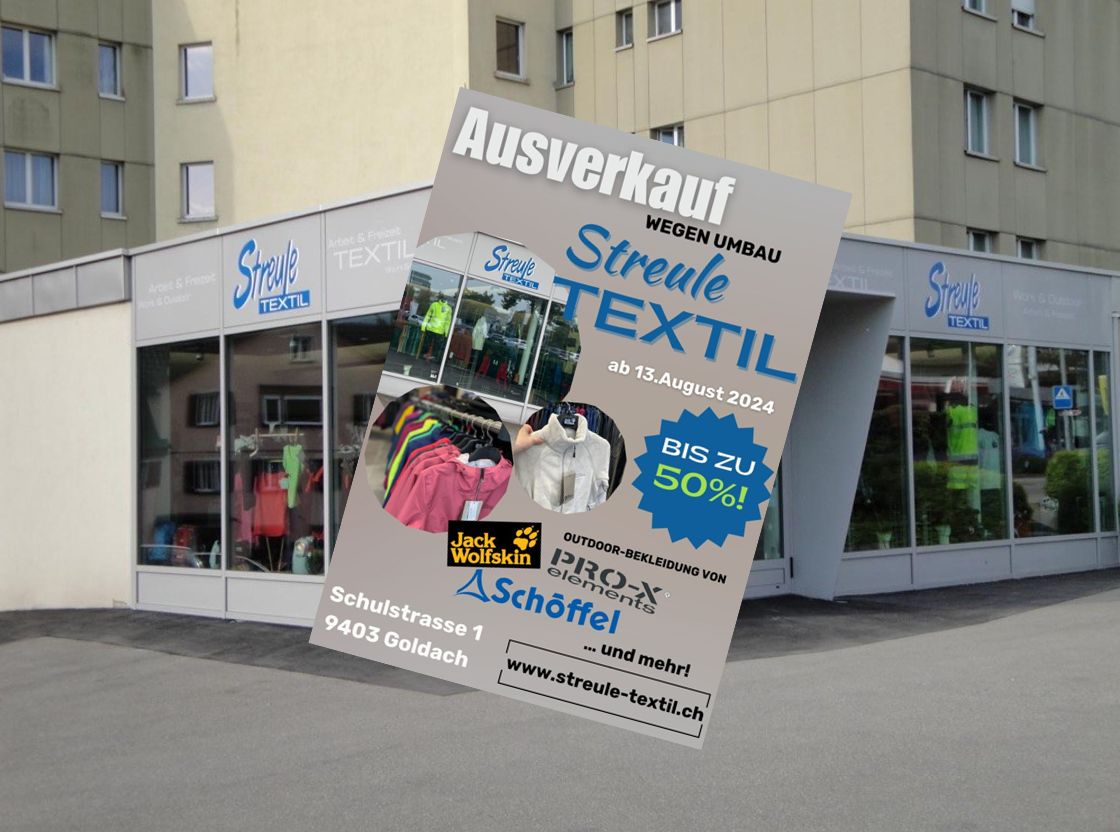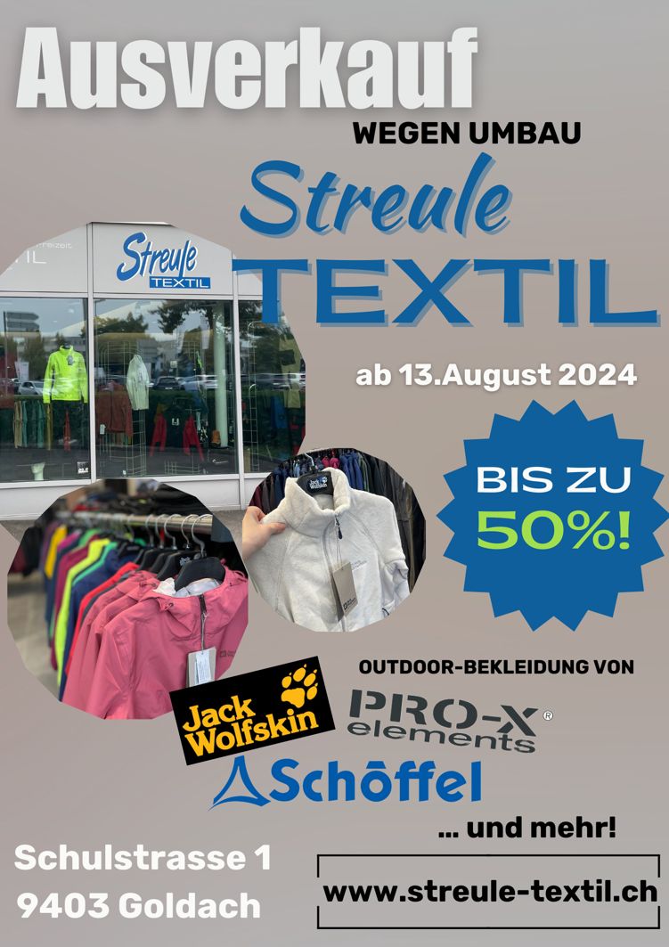 Inhaber Peter Müntener schreibt dazu: „Bei Streule Textil an der Schulstrasse 1 in Goldach gibt es ab morgen Dienstag, 13. August 2024, einen grossen Ausverkauf der Outdoor-Bekleidung – mit Rabatten von bis zu 50 Prozent. Grund ist ein bevorstehender Umbau des Ladens. Das Berufsbekleidungssortiment ist vom Ausverkauf nicht betroffen und wird wie bis anhin weitergeführt.“