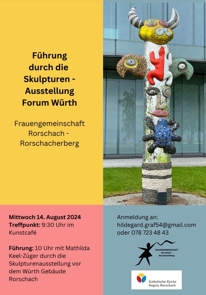 Die Frauengemeinschaft Rorschach-Rorschacherberg lässt sich morgen Mittwoch die Skulpturen-Ausstellung beim Würth Haus Rorschach zeigen. Anmelden kann man sich dafür bei Hildegard Graf per Mail oder über 078 723 48 43. Die wichtigsten Details findet man auf dem Flyer unten.