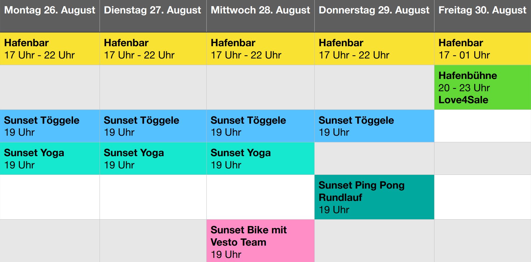 Noch bis kommenden Freitag kann man dieses einmalige Ambiente direkt am Rorschacher Seeufer geniessen. Das Programm der letzten Woche für die Strandfestwochen findet man unten: