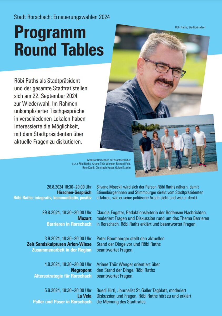 Abschluss der „Round Tables“ mit hochbrisantem ThemaThemen:Rorschach 5. September 2024 - 05:30Heute geht es zwischen 18.30 Uhr und 20.00 Uhr im La Vela in Rorschach um Poller und Poser.Teilen mit: Einen Link per E-Mail an einen Freund senden (Wird in neuem Fenster geöffnet) E-Mail Drucken (Wird in neuem Fenster geöffnet) Drucken Auf Facebook teilen (Wird in neuem Fenster geöffnet) Facebook Auf X teilen (Wird in neuem Fenster geöffnet) X Auf WhatsApp teilen (Wird in neuem Fenster geöffnet) WhatsApp Gefällt mir:Gefällt mir Wird geladen …Newsletter abonnieren Bitte dieses Feld leer lassenBitte wähle, ob Du über jeden neuen Beitrag sofort oder lieber jeden Morgen gegen 9 Uhr eine Zusammenfassung der neusten Beiträge erhalten möchtest.Liste(n) auswählen: Neues vom Echo (Zusammenfassung) Neues vom Echo (Sofortbenachrichtigung) Dieses Feld wird benötigt.Prüfen Sie Ihren Posteingang und den Spamordner, um Ihr Abonnement zu bestätigen.