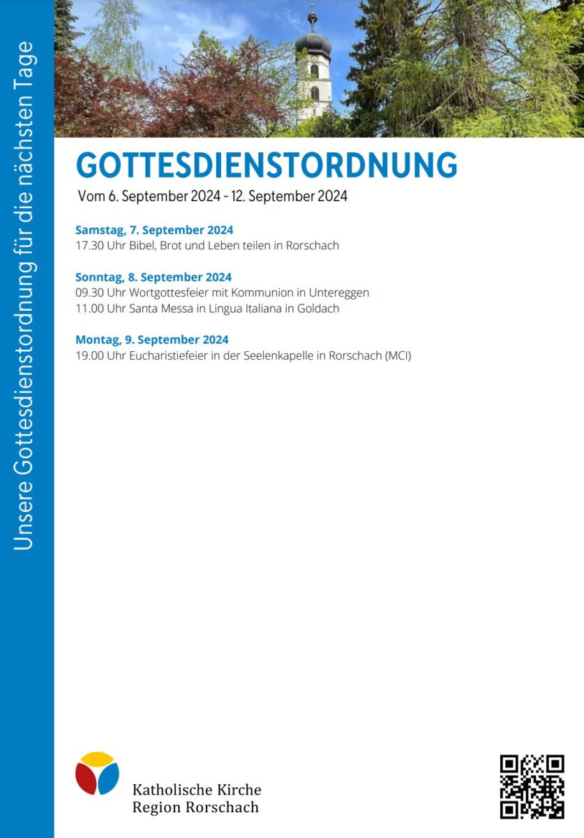 Gottesdienstordnung der KKRR für die nächsten TageThemen:Kath. RorschachKulturPartnerRegionRorschach 6. September 2024 - 05:15Gilt ab morgen Samstag bis kommenden Montag, 9. September 2024. Mehr Informationen finden Interessierte immer auch hier und hier.Teilen mit: Einen Link per E-Mail an einen Freund senden (Wird in neuem Fenster geöffnet) E-Mail Drucken (Wird in neuem Fenster geöffnet) Drucken Auf Facebook teilen (Wird in neuem Fenster geöffnet) Facebook Auf X teilen (Wird in neuem Fenster geöffnet) X Auf WhatsApp teilen (Wird in neuem Fenster geöffnet) WhatsApp Gefällt mir:Gefällt mir Wird geladen …Newsletter abonnieren Bitte dieses Feld leer lassenBitte wähle, ob Du über jeden neuen Beitrag sofort oder lieber jeden Morgen gegen 9 Uhr eine Zusammenfassung der neusten Beiträge erhalten möchtest.Liste(n) auswählen: Neues vom Echo (Zusammenfassung) Neues vom Echo (Sofortbenachrichtigung) Dieses Feld wird benötigt.Prüfen Sie Ihren Posteingang und den Spamordner, um Ihr Abonnement zu bestätigen.