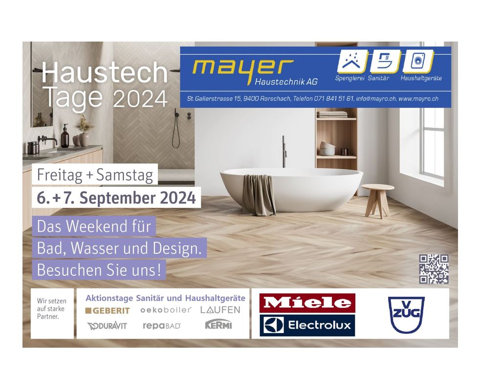 Noch heute Samstag finden die Haustechtage 2024 statt. Grund genug für das Team der Mayer Haustechnik AG in Rorschach, an die St.Gallerstrasse 15 einzuladen und zu zeigen, wie sie das Motto “Das Weekend für Bad, Wasser und Design” im Alltag umsetzen. Mehr Informationen dazu findet man hier, hier, hier und hier.