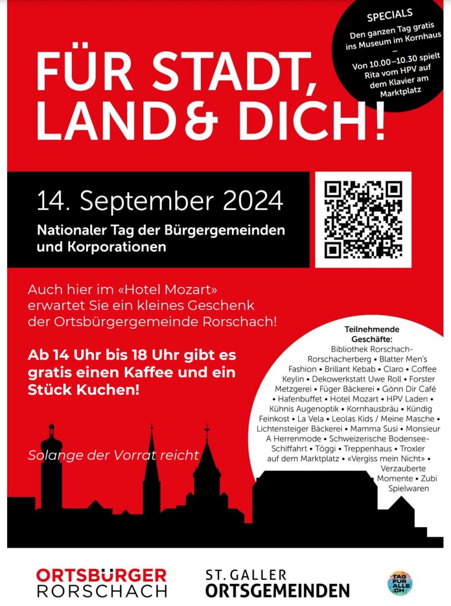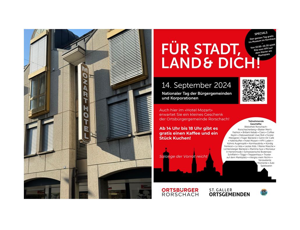 Das Rorschacher Echo begleitet diese wunderbare Idee der Ortsbürger! Bei der Fülle von 27 Geschäften und Restaurants wird bereits heute mit den einzelnen Hinweisen gestartet, aber die einzelnen Überraschungen gelten nur am 14. September 2024! Der hier gezeigte Hinweis bezieht sich auf das Hotel Mozart in Rorschach.