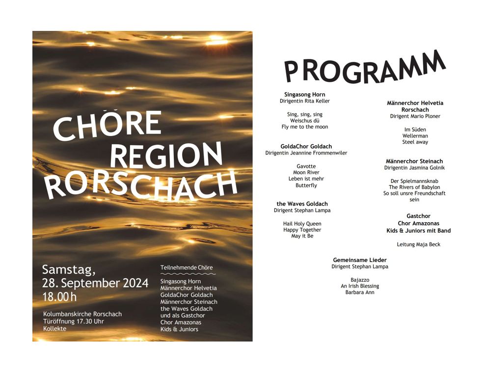 Kommenden Samstag singen die Chöre der RegionThemen:KulturRorschach 23. September 2024 - 05:25Letztlich werden es dann so rund 180 Sängerinnen und Sänger sein, die mit ihrem Chorkonzert die Besucherinnen und Besucher in der Kolumbanskirche in Rorschach erfreuen. Beginn ist um 18 Uhr. Türöffnung um 17.30 Uhr.Teilen mit: Einen Link per E-Mail an einen Freund senden (Wird in neuem Fenster geöffnet) E-Mail Drucken (Wird in neuem Fenster geöffnet) Drucken Auf Facebook teilen (Wird in neuem Fenster geöffnet) Facebook Auf X teilen (Wird in neuem Fenster geöffnet) X Auf WhatsApp teilen (Wird in neuem Fenster geöffnet) WhatsApp Gefällt mir:Gefällt mir Wird geladen …Newsletter abonnieren Bitte dieses Feld leer lassenBitte wähle, ob Du über jeden neuen Beitrag sofort oder lieber jeden Morgen gegen 9 Uhr eine Zusammenfassung der neusten Beiträge erhalten möchtest.Liste(n) auswählen: Neues vom Echo (Zusammenfassung) Neues vom Echo (Sofortbenachrichtigung) Dieses Feld wird benötigt.Prüfen Sie Ihren Posteingang und den Spamordner, um Ihr Abonnement zu bestätigen.