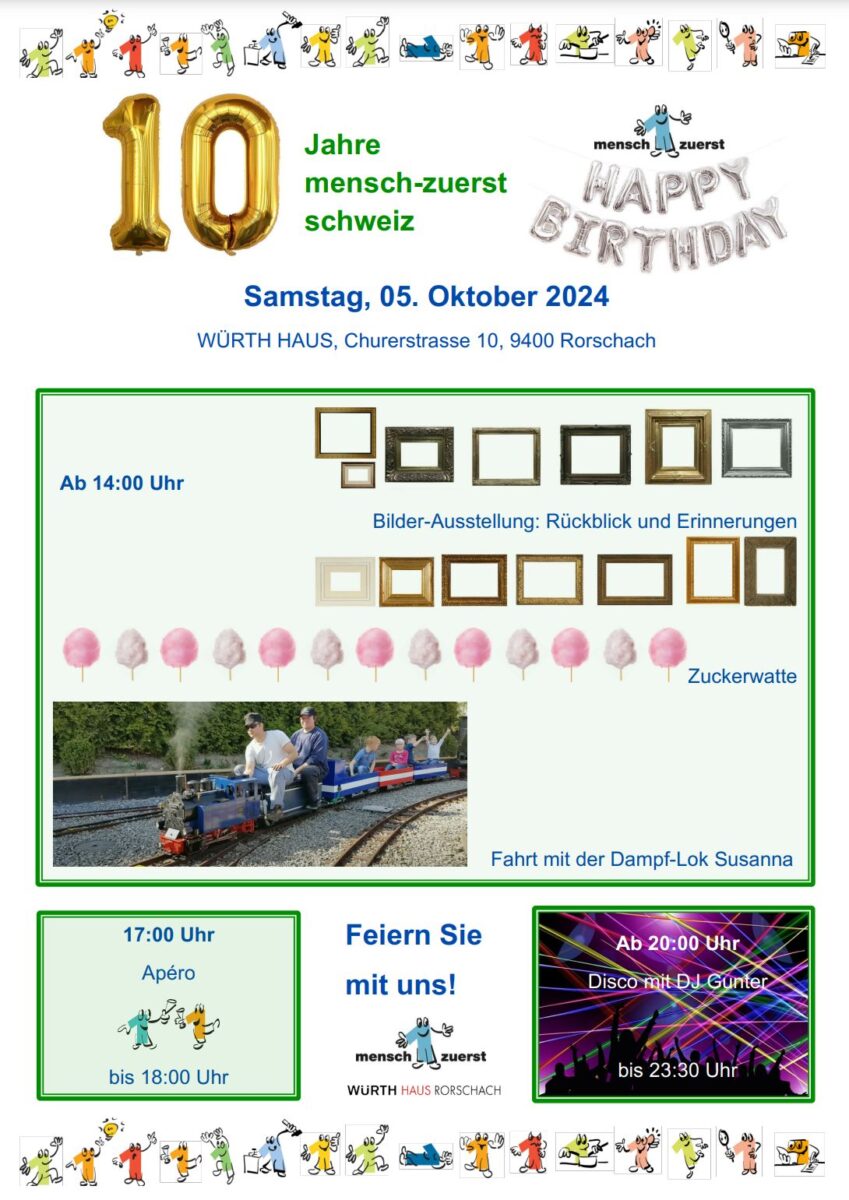 Kommenden Samstag feiert die Organisation „mensch-zuerst“ ihr 10-jähriges Jubiläum mit einem Festanlass im Würth Haus Rorschach. In Rorschach ist „mensch-zuerst“ an der Pestalozzistrasse 11 daheim. Mehr über diese Organisation finden Interessierte hier.