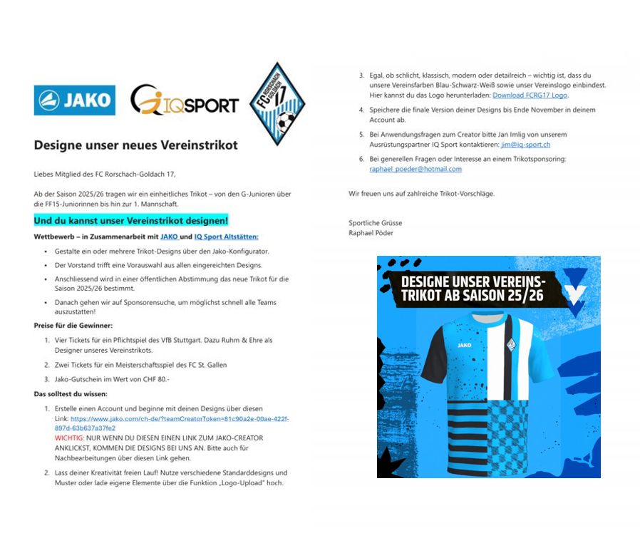 Ab kommender Saison trägt der FC Rorschach-Goldach 17 ein einheitliches Trikot – von den G-Junioren über die FF15-Juniorinnen bis hin zur 1. Mannschaft. Wer das neue Vereinstrikot designet wird mit einem Wettbewerb in Zusammenarbeit mit JAKO und IQ Sport Altstätten ermittelt. Designs können bis Ende November kreiert werden. Mehr Infos rund um diese nicht alltägliche Aktion findet man hier.