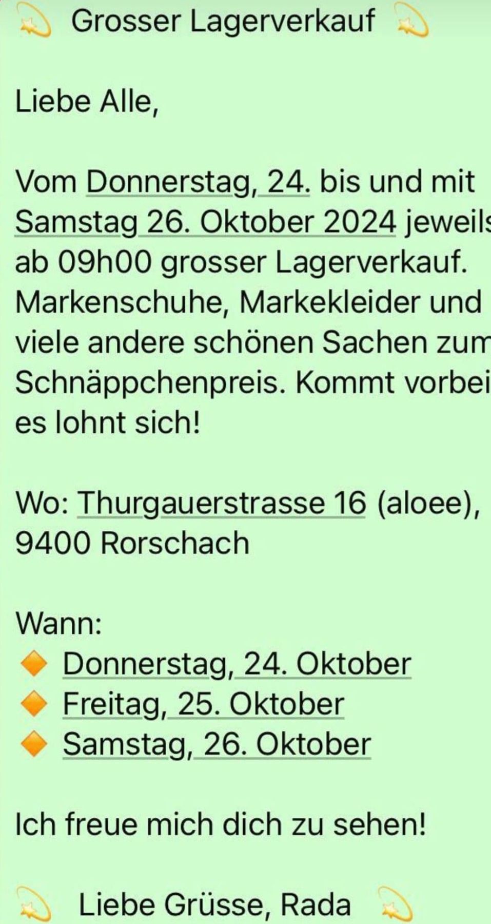 Eine Rorschacherin mit ganz speziellem LagerverkaufThemen:Rorschach 24. Oktober 2024 - 08:38Rada Budimir wird heute, morgen Freitag und übermorgen Samstag an der Thurgauerstrasse 16 einen ganz speziellen Lagerverkauf anbieten. Inegüxle lohnt sich. Offen jeweils ab 9 Uhr. Teilen mit: Einen Link per E-Mail an einen Freund senden (Wird in neuem Fenster geöffnet) E-Mail Drucken (Wird in neuem Fenster geöffnet) Drucken Auf Facebook teilen (Wird in neuem Fenster geöffnet) Facebook Auf X teilen (Wird in neuem Fenster geöffnet) X Auf WhatsApp teilen (Wird in neuem Fenster geöffnet) WhatsApp Gefällt mir:Gefällt mir Wird geladen …Newsletter abonnieren Bitte dieses Feld leer lassenBitte wähle, ob Du über jeden neuen Beitrag sofort oder lieber jeden Morgen gegen 9 Uhr eine Zusammenfassung der neusten Beiträge erhalten möchtest.Liste(n) auswählen: Neues vom Echo (Zusammenfassung) Neues vom Echo (Sofortbenachrichtigung) Dieses Feld wird benötigt.Prüfen Sie Ihren Posteingang und den Spamordner, um Ihr Abonnement zu bestätigen.
