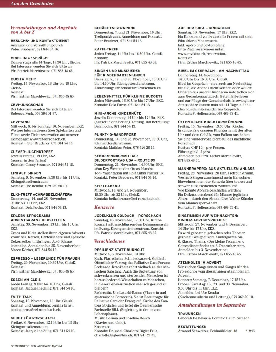 Das Angebot von Ref. Rorschach im November 2024Themen:KulturPartnerRef. RorschachRorschach 2. November 2024 - 05:25Mehr Informationen zum reichhaltigen Angebot finden Interessierte immer auch hier, hier und hier. Teilen mit: Einen Link per E-Mail an einen Freund senden (Wird in neuem Fenster geöffnet) E-Mail Drucken (Wird in neuem Fenster geöffnet) Drucken Auf Facebook teilen (Wird in neuem Fenster geöffnet) Facebook Auf X teilen (Wird in neuem Fenster geöffnet) X Auf WhatsApp teilen (Wird in neuem Fenster geöffnet) WhatsApp Gefällt mir:Gefällt mir Wird geladen …Newsletter abonnieren Bitte dieses Feld leer lassenBitte wähle, ob Du über jeden neuen Beitrag sofort oder lieber jeden Morgen gegen 9 Uhr eine Zusammenfassung der neusten Beiträge erhalten möchtest.Liste(n) auswählen: Neues vom Echo (Zusammenfassung) Neues vom Echo (Sofortbenachrichtigung) Dieses Feld wird benötigt.Prüfen Sie Ihren Posteingang und den Spamordner, um Ihr Abonnement zu bestätigen.