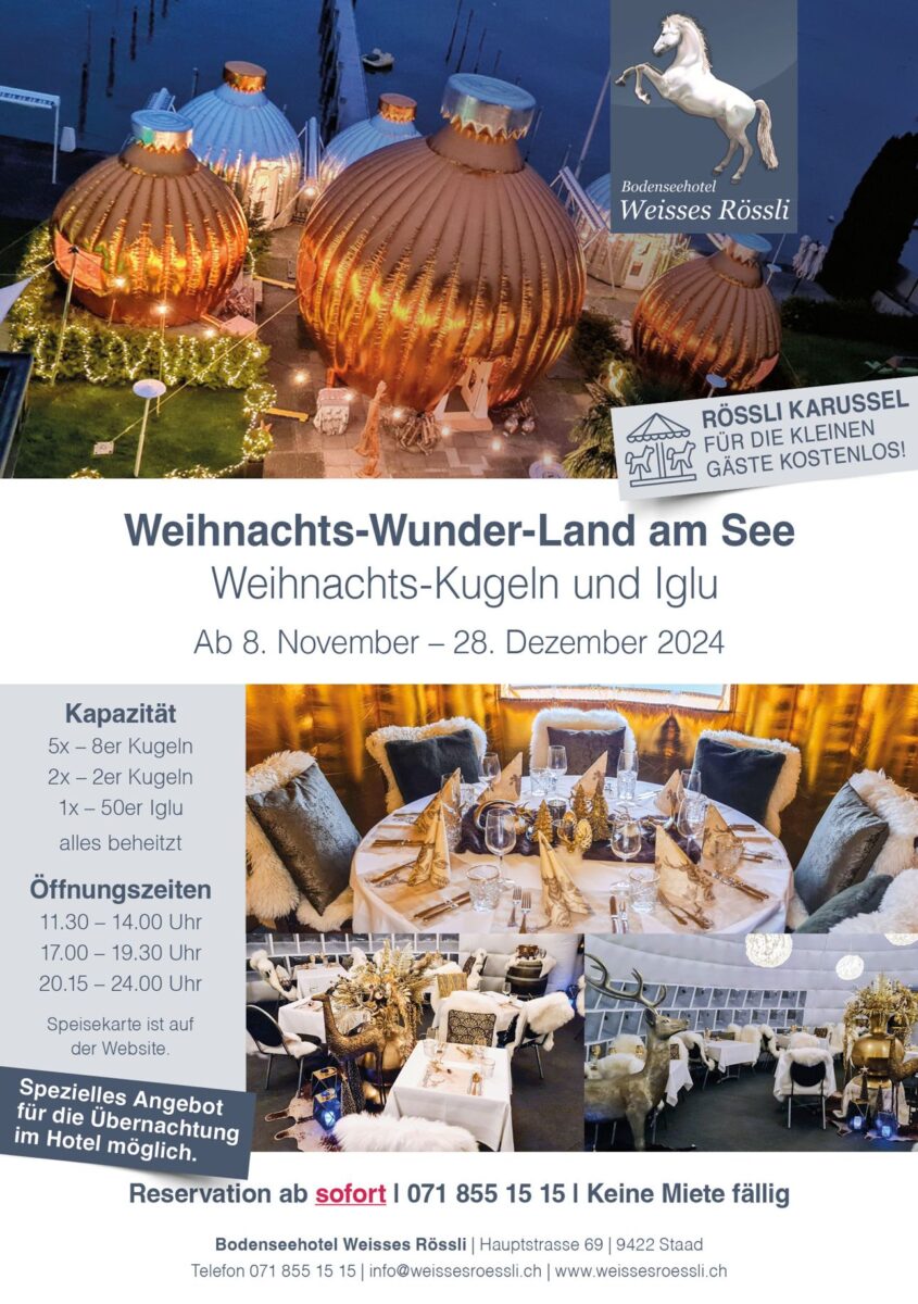 In Staad startet heute das Weihnachts-WunderlandThemen:KulturRegion 8. November 2024 - 12:05Das Weisse Rössli in Staad hat umgebaut und im Garten erwartet die Gäste ein Weihnachts-Wunderland. Teilen mit: Einen Link per E-Mail an einen Freund senden (Wird in neuem Fenster geöffnet) E-Mail Drucken (Wird in neuem Fenster geöffnet) Drucken Auf Facebook teilen (Wird in neuem Fenster geöffnet) Facebook Auf X teilen (Wird in neuem Fenster geöffnet) X Auf WhatsApp teilen (Wird in neuem Fenster geöffnet) WhatsApp Gefällt mir:Gefällt mir Wird geladen …Newsletter abonnieren Bitte dieses Feld leer lassenBitte wähle, ob Du über jeden neuen Beitrag sofort oder lieber jeden Morgen gegen 9 Uhr eine Zusammenfassung der neusten Beiträge erhalten möchtest.Liste(n) auswählen: Neues vom Echo (Zusammenfassung) Neues vom Echo (Sofortbenachrichtigung) Dieses Feld wird benötigt.Prüfen Sie Ihren Posteingang und den Spamordner, um Ihr Abonnement zu bestätigen.