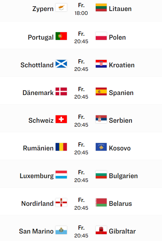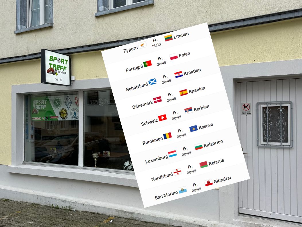 Nations-League: Der Schweiz hilft heute nur ein SiegThemen:BeizenKulturRorschachSporttreff 15. November 2024 - 12:00Das Spiel der Schweizer Fussballnati wird natürlich auch im SportTreff Rorschach übertragen – nebst anderen Partien auch.Teilen mit: Einen Link per E-Mail an einen Freund senden (Wird in neuem Fenster geöffnet) E-Mail Drucken (Wird in neuem Fenster geöffnet) Drucken Auf Facebook teilen (Wird in neuem Fenster geöffnet) Facebook Auf X teilen (Wird in neuem Fenster geöffnet) X Auf WhatsApp teilen (Wird in neuem Fenster geöffnet) WhatsApp Gefällt mir:Gefällt mir Wird geladen …Newsletter abonnieren Bitte dieses Feld leer lassenBitte wähle, ob Du über jeden neuen Beitrag sofort oder lieber jeden Morgen gegen 9 Uhr eine Zusammenfassung der neusten Beiträge erhalten möchtest.Liste(n) auswählen: Neues vom Echo (Zusammenfassung) Neues vom Echo (Sofortbenachrichtigung) Dieses Feld wird benötigt.Prüfen Sie Ihren Posteingang und den Spamordner, um Ihr Abonnement zu bestätigen.