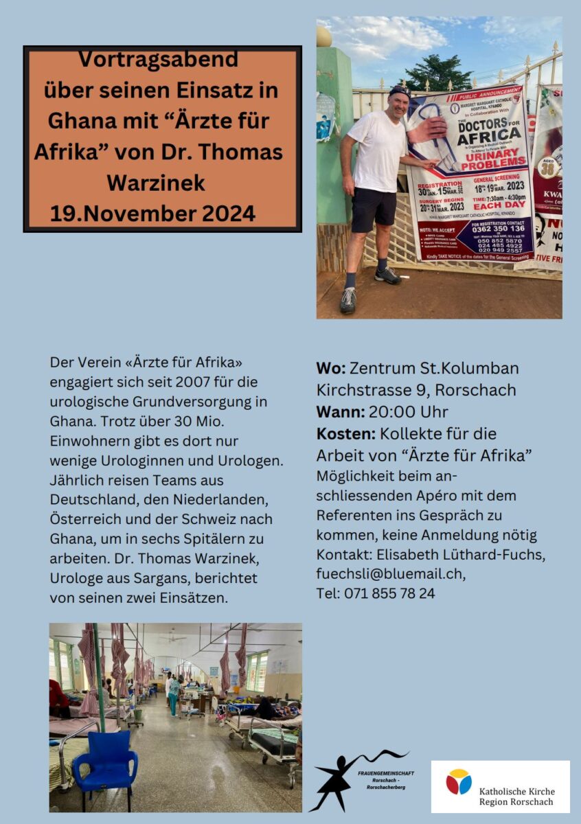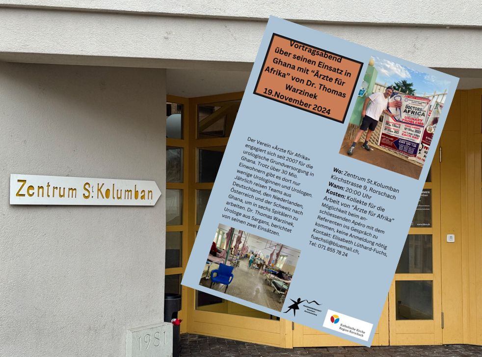 Heute Dienstagabend ab 20 Uhr im Kolumbanszentrum: „Der Verein «Ärzte für Afrika» engagiert sich seit 2007 für die urologische Grundversorgung in Ghana. Trotz über 30 Mio. Einwohnern gibt es dort nur wenige Urologinnen und Urologen. Jährlich reisen Teams aus Deutschland, den Niederlanden, Österreich und der Schweiz nach Ghana, um in sechs Spitälern zu arbeiten. Dr. Thomas Warzinek, Urologe aus Sargans, berichtet von seinen zwei Einsätzen.