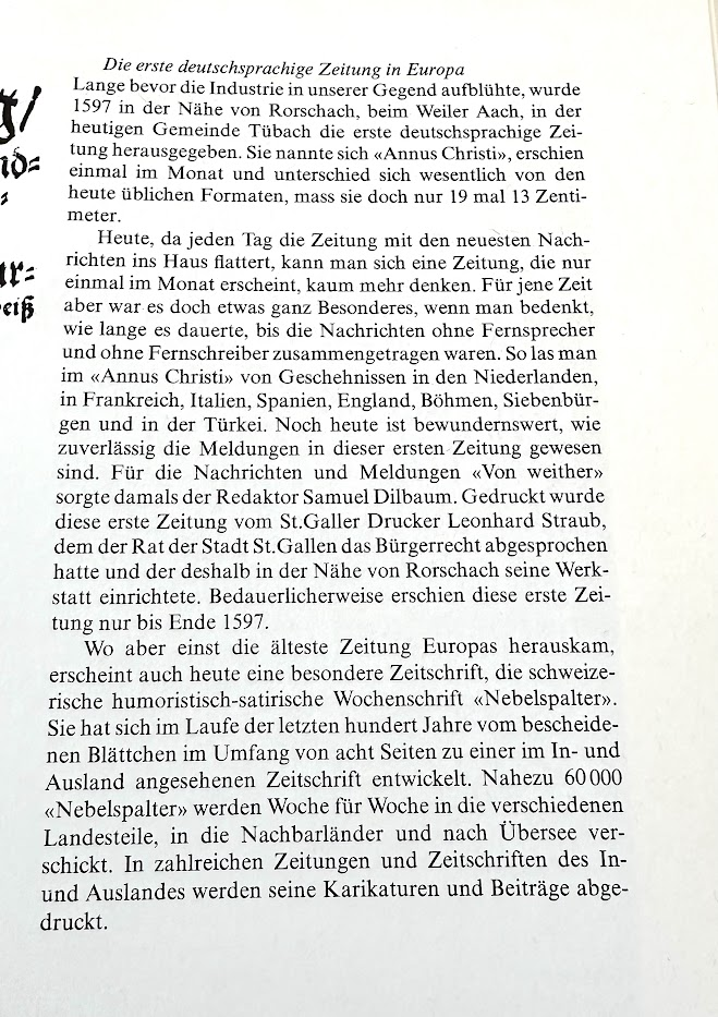 Und plötzlich erhält man echte Trouvaillen zugeschicktThemen:Kultur SporttreffRegionRorschach 21. November 2024 - 05:05Allein schon das genannte Jahr „1597“ macht ein wenig ehrfürchtig. Danke, Kurt! Teilen mit: Einen Link per E-Mail an einen Freund senden (Wird in neuem Fenster geöffnet) E-Mail Drucken (Wird in neuem Fenster geöffnet) Drucken Auf Facebook teilen (Wird in neuem Fenster geöffnet) Facebook Auf X teilen (Wird in neuem Fenster geöffnet) X Auf WhatsApp teilen (Wird in neuem Fenster geöffnet) WhatsApp Gefällt mir:Gefällt mir Wird geladen …Newsletter abonnieren Bitte dieses Feld leer lassenBitte wähle, ob Du über jeden neuen Beitrag sofort oder lieber jeden Morgen gegen 9 Uhr eine Zusammenfassung der neusten Beiträge erhalten möchtest.Liste(n) auswählen: Neues vom Echo (Zusammenfassung) Neues vom Echo (Sofortbenachrichtigung) Dieses Feld wird benötigt.Prüfen Sie Ihren Posteingang und den Spamordner, um Ihr Abonnement zu bestätigen.