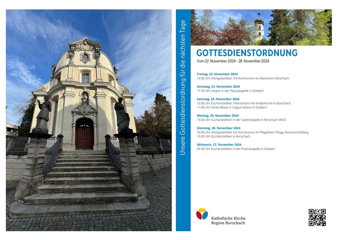 Gottesdienstordnung der KKRR für die nächsten TageThemen:Kath. RorschachKulturPartnerRegionRorschach 22. November 2024 - 05:20Gilt ab heute Freitag bis kommenden Mittwoch, 27. November 2024. Mehr Informationen finden Interessierte immer auch hier und hier.Teilen mit: Einen Link per E-Mail an einen Freund senden (Wird in neuem Fenster geöffnet) E-Mail Drucken (Wird in neuem Fenster geöffnet) Drucken Auf Facebook teilen (Wird in neuem Fenster geöffnet) Facebook Auf X teilen (Wird in neuem Fenster geöffnet) X Auf WhatsApp teilen (Wird in neuem Fenster geöffnet) WhatsApp Gefällt mir:Gefällt mir Wird geladen …Newsletter abonnieren Bitte dieses Feld leer lassenBitte wähle, ob Du über jeden neuen Beitrag sofort oder lieber jeden Morgen gegen 9 Uhr eine Zusammenfassung der neusten Beiträge erhalten möchtest.Liste(n) auswählen: Neues vom Echo (Zusammenfassung) Neues vom Echo (Sofortbenachrichtigung) Dieses Feld wird benötigt.Prüfen Sie Ihren Posteingang und den Spamordner, um Ihr Abonnement zu bestätigen.
