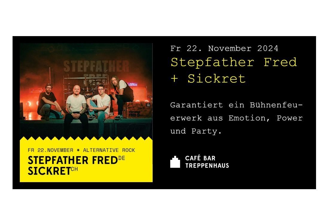 Stepfather Fred & Sickret auf der Treppenhaus-BühneThemen:BeizenKulturRorschachTreppenhaus 22. November 2024 - 05:25Mehr Infos (und Videos) um die Konzerte von heute Freitagabend im Rorschacher Treppenhaus findet man hier.Teilen mit: Einen Link per E-Mail an einen Freund senden (Wird in neuem Fenster geöffnet) E-Mail Drucken (Wird in neuem Fenster geöffnet) Drucken Auf Facebook teilen (Wird in neuem Fenster geöffnet) Facebook Auf X teilen (Wird in neuem Fenster geöffnet) X Auf WhatsApp teilen (Wird in neuem Fenster geöffnet) WhatsApp Gefällt mir:Gefällt mir Wird geladen …Newsletter abonnieren Bitte dieses Feld leer lassenBitte wähle, ob Du über jeden neuen Beitrag sofort oder lieber jeden Morgen gegen 9 Uhr eine Zusammenfassung der neusten Beiträge erhalten möchtest.Liste(n) auswählen: Neues vom Echo (Zusammenfassung) Neues vom Echo (Sofortbenachrichtigung) Dieses Feld wird benötigt.Prüfen Sie Ihren Posteingang und den Spamordner, um Ihr Abonnement zu bestätigen.