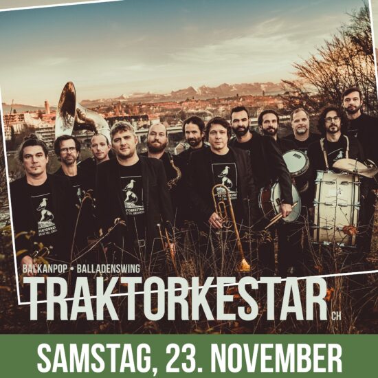 „Traktorkestar“ ist eine herz- und kopfzerreissende Blaskapelle aus Bern und steht heute Abend auf der Bühne in der Industrie36 in Rorschach. Hochgeschwindigkeits-Discogrooves, fanfariger Sirenenturbo, blutunterlaufene Herzschmerzballaden, himmelhochjauchzende Heimwehmelodien, stets rumplig und brandgefährlich! Die zeitgemässe Interpretation des Genres kommt bei den Livekonzerten voll zum Tragen. Für die Einen gipfelt die Darbietung im Tanzrausch, für die Andern auch. Traktorkestar verbindet seit nunmehr anderthalb Dekaden nicht nur eigene Musik mit jener des Balkans, sondern schlägt auch Brücken zwischen Stadt und Land, zwischen Tradition und Moderne, sprich: zwischen Traktor und Orchester! (Text/Bild/Video: pd ind36 abm)