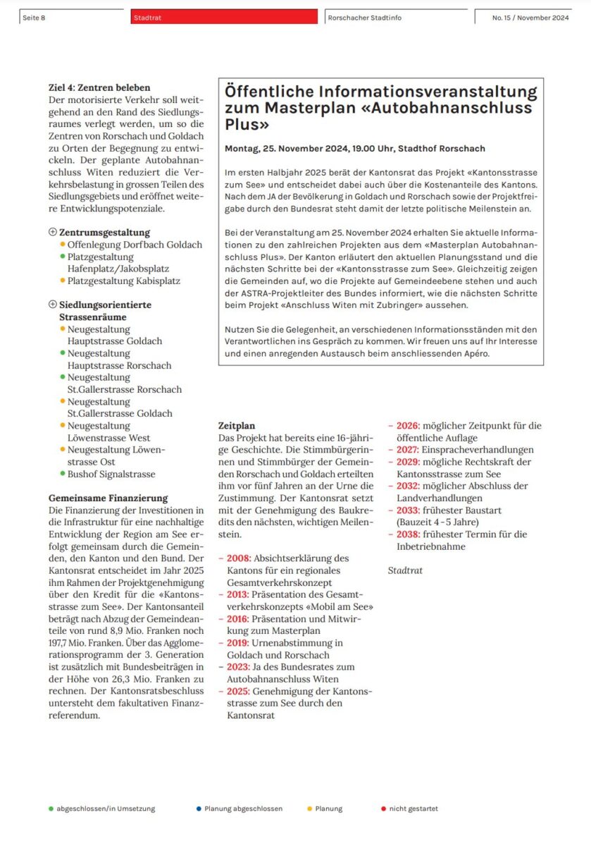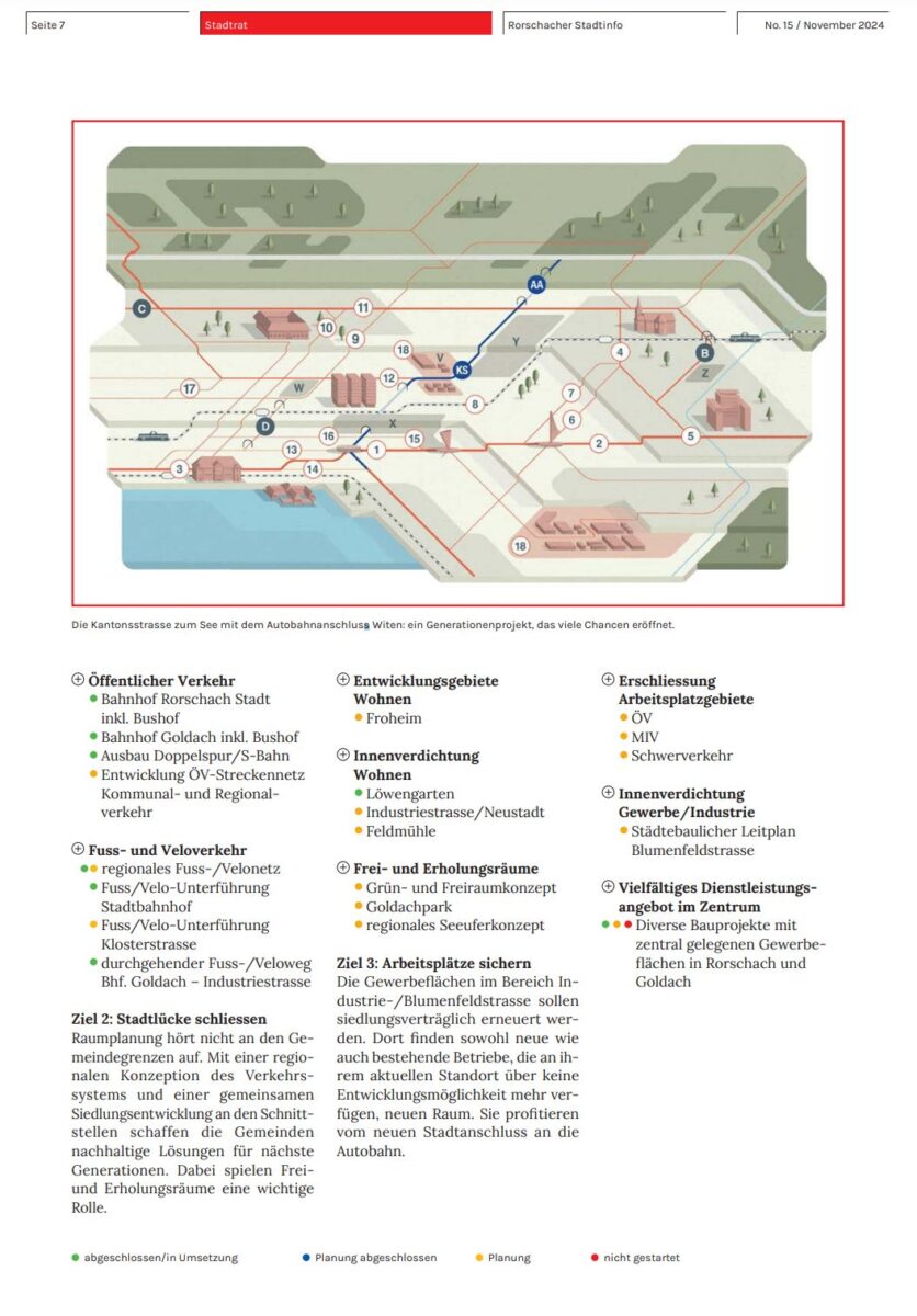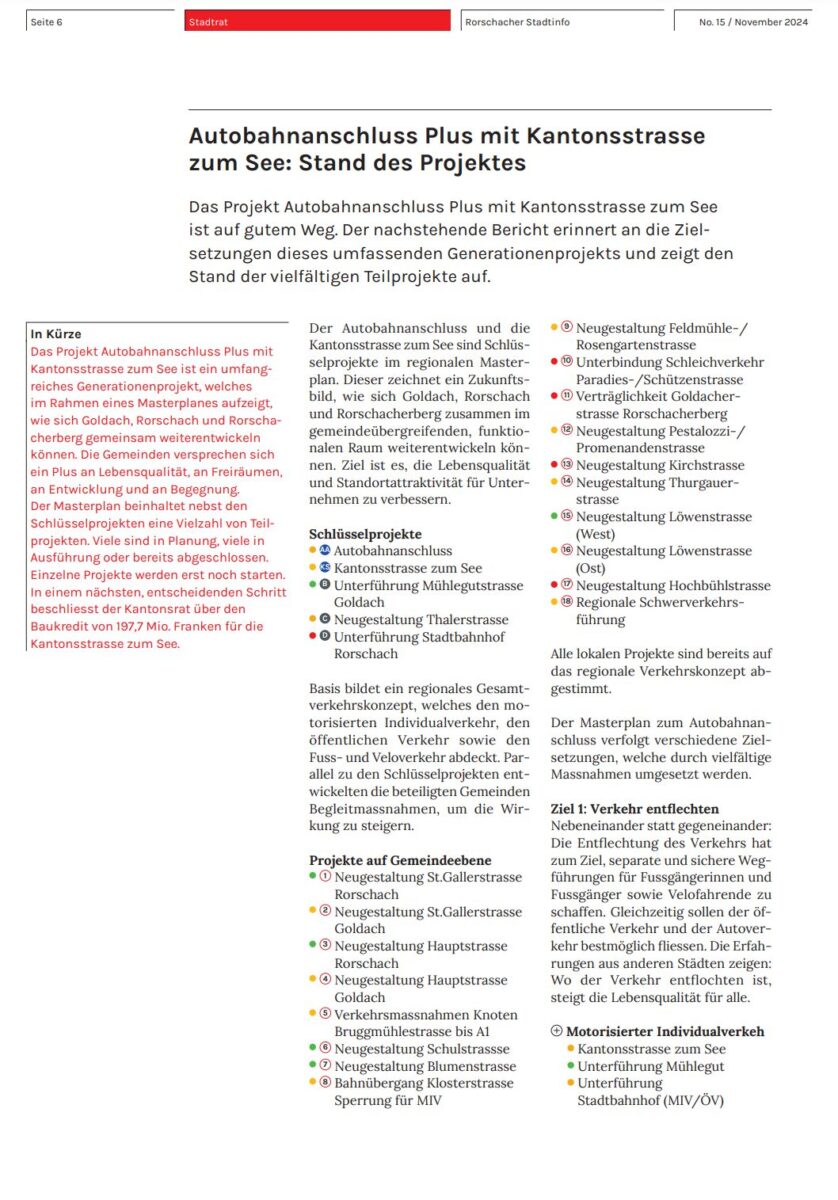 Aus den aktuellen Stadtinfos: „Das Projekt Autobahnanschluss Plus mit Kantonsstrasse zum See ist ein umfangreiches Generationenprojekt, welches im Rahmen eines Masterplanes aufzeigt, wie sich Goldach, Rorschach und Rorschacherberg gemeinsam weiterentwickeln können. Die Gemeinden versprechen sich ein Plus an Lebensqualität, an Freiräumen, an Entwicklung und an Begegnung. Der Masterplan beinhaltet nebst den Schlüsselprojekten eine Vielzahl von Teilprojekten. Viele sind in Planung, viele in Ausführung oder bereits abgeschlossen. Einzelne Projekte werden erst noch starten. In einem nächsten, entscheidenden Schritt beschliesst der Kantonsrat über den Baukredit von 197,7 Mio. Franken für die Kantonsstrasse zum See.“ Zu diesem Projekt findet morgen Montagabend im Stadthofsaal ab 19 Uhr ein Infoabend statt. Wer da an Informationen interessiert ist muss selber vor Ort. Das Rorschacher Echo ist wegen einem anderen Termin nicht vor Ort. Den ganzen Artikel findet man online auch hier.