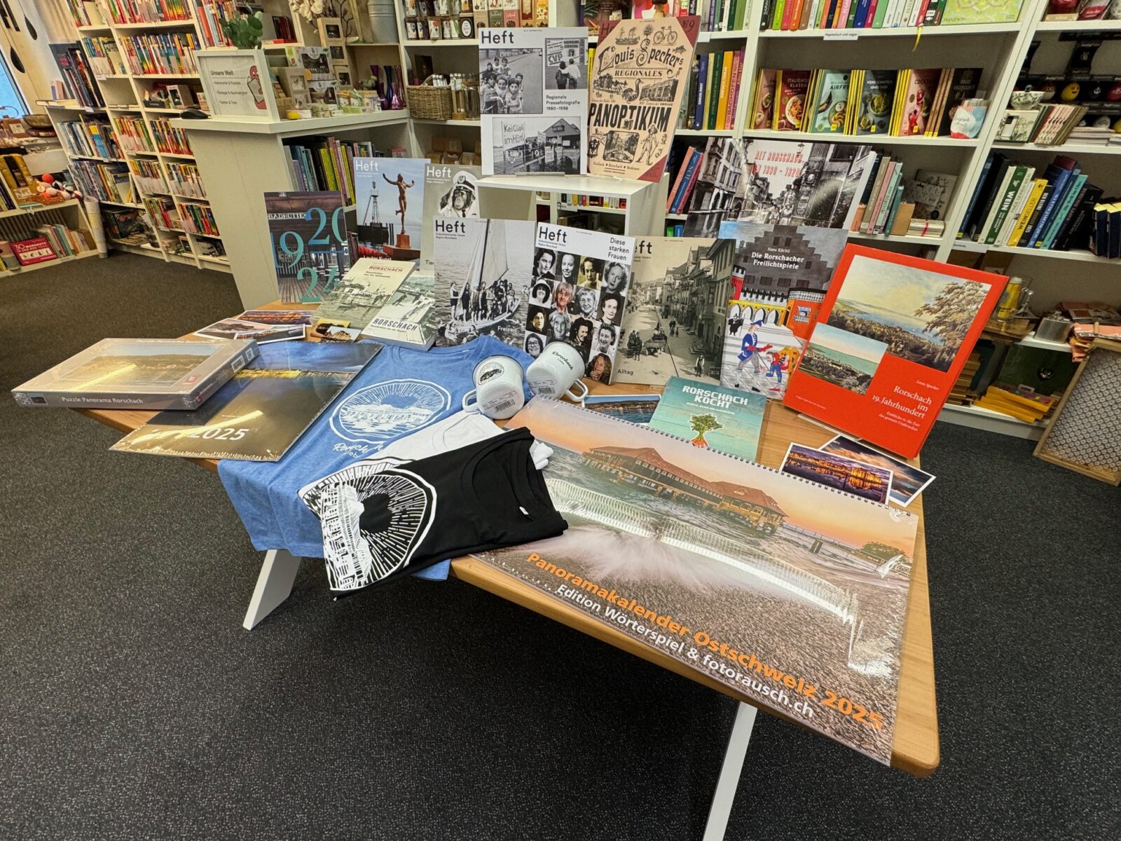 Es ist auch optisch recht hüppig, wenn man sieht, was es in der Buchhandlung WörterSpiel alles zu kaufen gibt, was noch viel Rorschach beinhaltet. Der Rorschacher Jahreskalender erfreut sich weiterhin grosser Beliebtheit und wird demnächst bereits rar und die beiden Rorschacher Bücher von Otmar Elsener bleiben auch dieses Jahr Klassiker. Und dann kommt noch dies und das dazu…